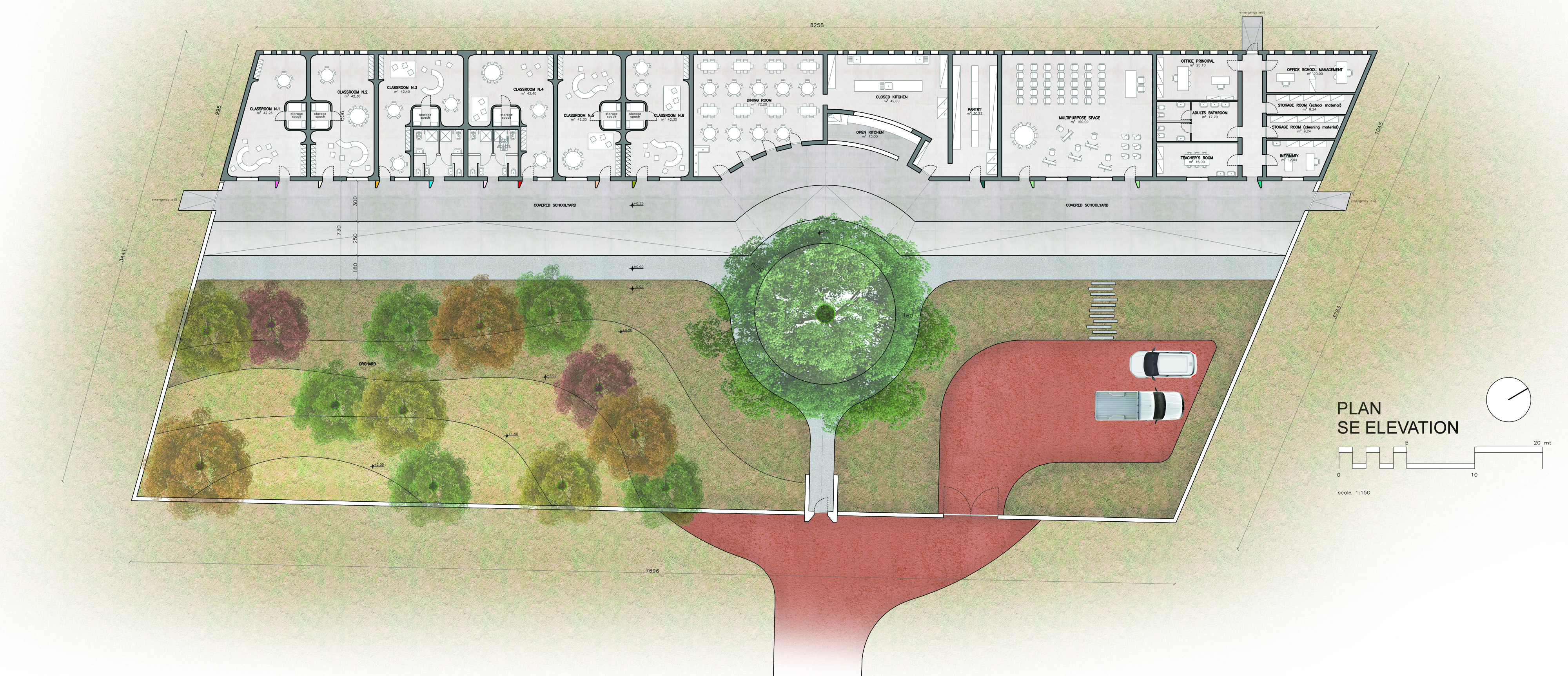 La salvaguardia dell’albero contraddistingue l’intera progettazione. Il volume compatto della scuola, in corrispondenza della Marula, si deforma in un ampio arco di circonferenza. L’edificio è coperto da un grande lastra piana che si rastrema negli sbalzi perimetrali. Anch’essa registra la presenza della folta chioma dell’albero, deviando il rettifilo di bordo in una insenatura curvilinea.