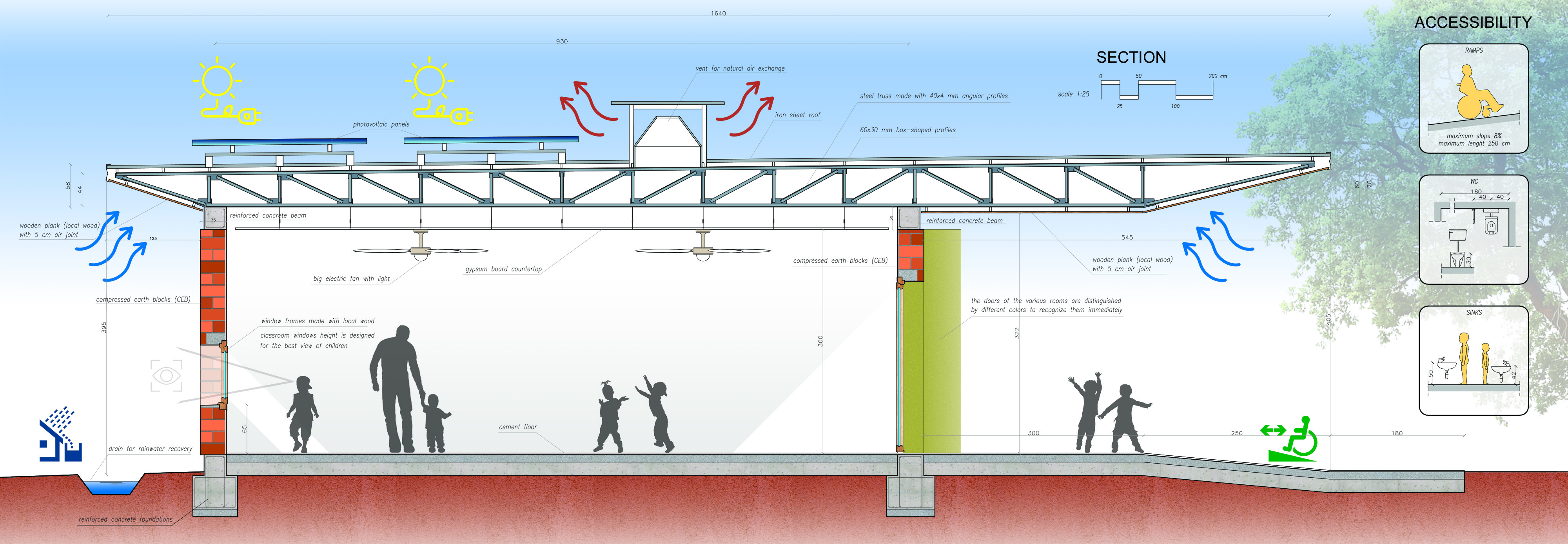 Il pavimento della scuola è rialzato di circa 25 cm rispetto al piano di campagna. Il raccordo tra i due piani viene realizzato tramite un piano inclinato che corre lungo tutto l’edificio. Questa rampa lunga oltre 80 metri garantisce un’accessibilità totale e fluida a tutti gli spazi della scuola, e rappresenta anche una formidabile occasione per il gioco dei bambini.