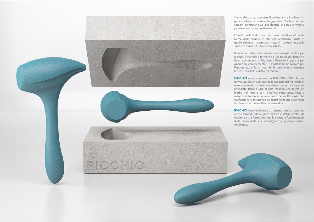 PICCHIO è un mazzuolo in BLU CORINTHO. Ha una forma sinuosa che asseconda la capacità del materiale di essere stampato. La testa circolare si rastrema alla penna affusolata tramite una calotta rotonda che forma un lembo nell'innesto con la pancia sottostante. Testa e manico si fondono in una unica curva flessuosa che trasforma la rude estetica del martello in una esperienza tattile e visiva dalla eclatante sensualità.