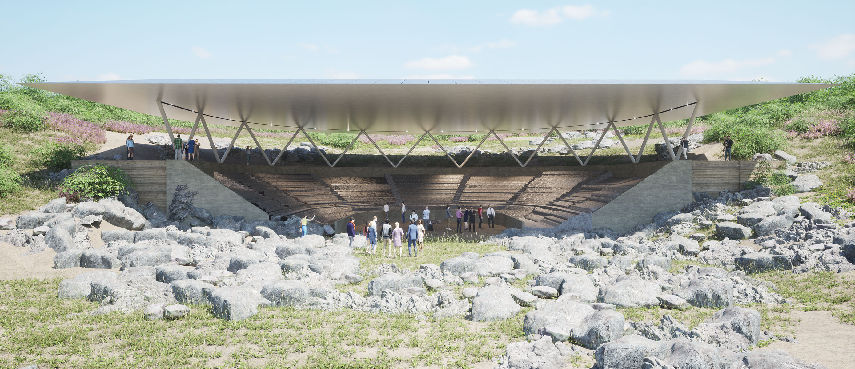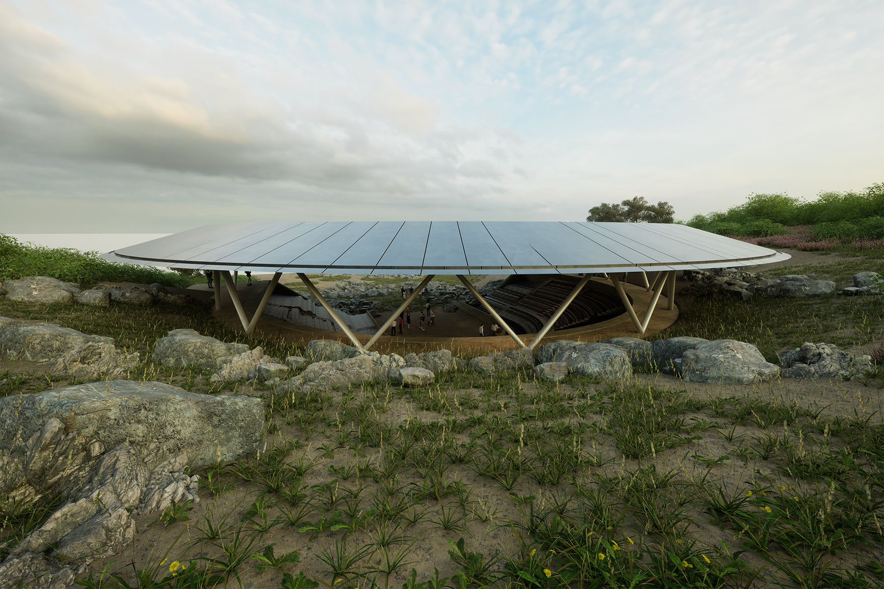 L’idea è formalmente semplice: una grande superficie piana sospesa a 4 mt di altezza che ricalca il perimetro del teatro e lo espande con uno sbalzo tale da potenziarne la protezione. Il segno è minimale ma capace di circoscrivere un volume poderoso. La materia di questa ampia lastra riflette con la sua calma planarità le rovine antiche, accrescendone la percezione in un vibrato di immagini speculari. La pulizia del linguaggio contemporaneo fa da contrappunto alla complessità destrutturata dell’antico, e di questo ne è al servizio.