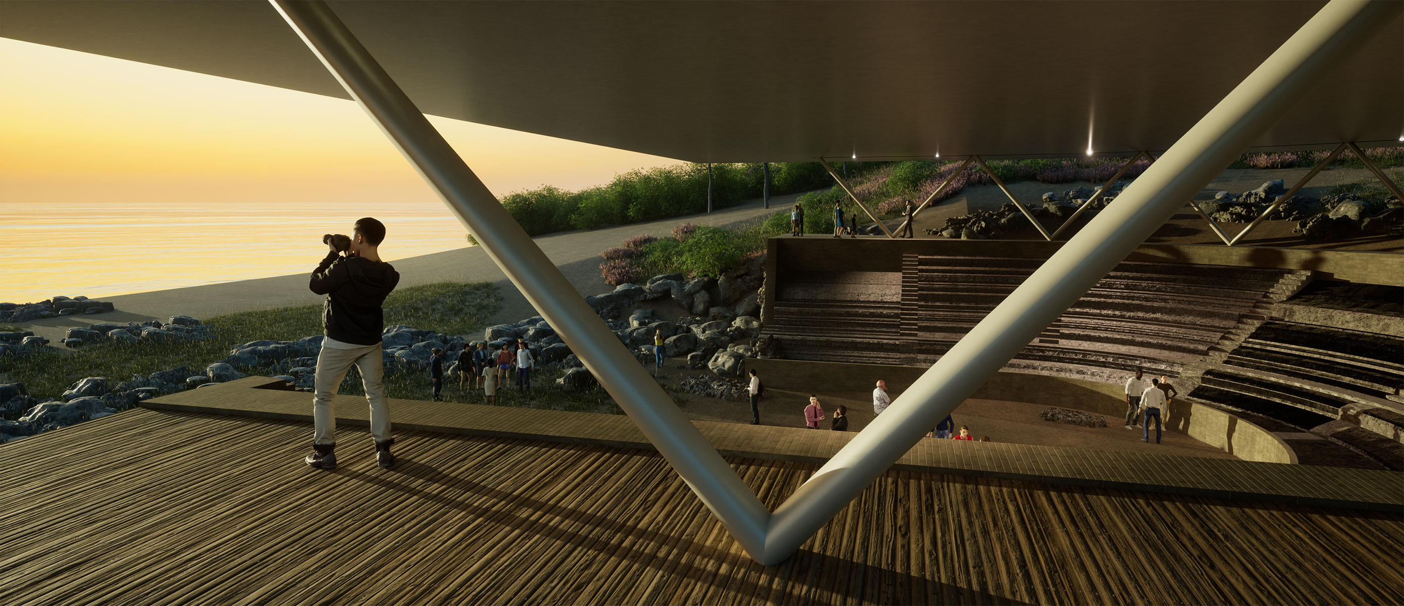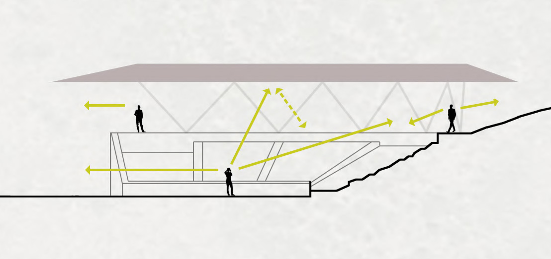 Il posizionamento della nuova copertura a 4 mt di altezza rispetto alla quota sommitale della cavea consente al teatro di liberarsi delle sovrastrutture passate, ritrovando la giusta fruizione visiva e recuperando il dialogo con il contesto archeologico e ambientale circostante. La copertura ad un’unica campata consente al visitatore di avvicinarsi alla cavea tramite un accesso diretto al cerchio dell’orchestra. La posizione centrale regala così una visione centrifuga completa delle gradonate antiche. A questa, il progetto aggiunge una nuova visione centripeta del teatro. Viene infatti creato un inedito percorso che corre sulla circonferenza sommitale del teatro regalando un punto di vista periferico della platea, indirizzato verso il centro dell’orchestra