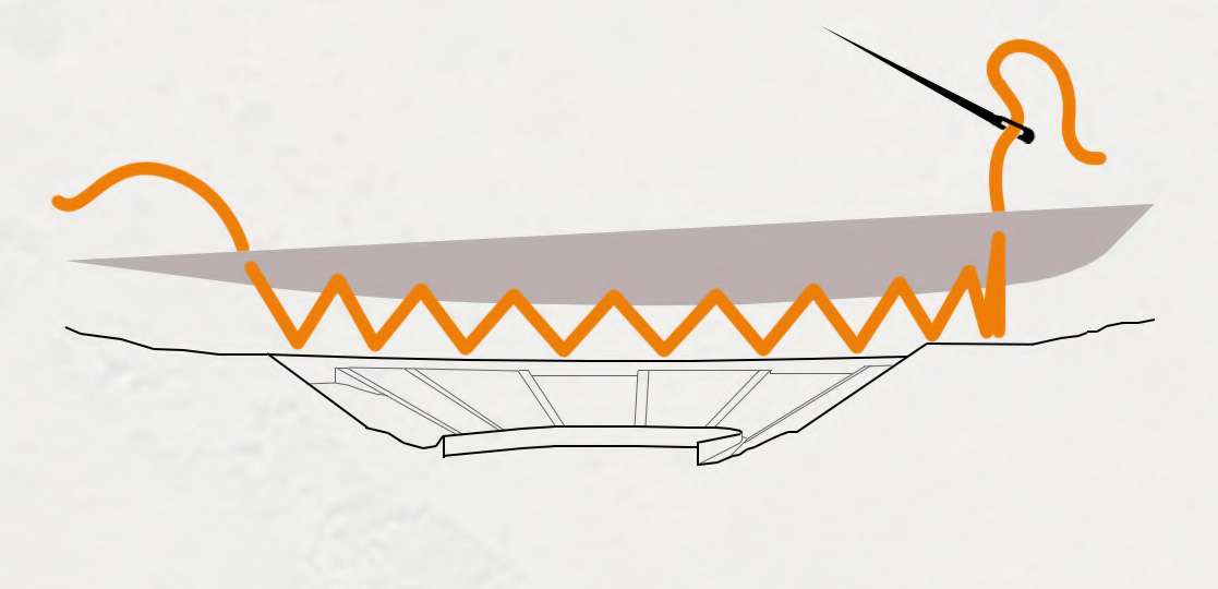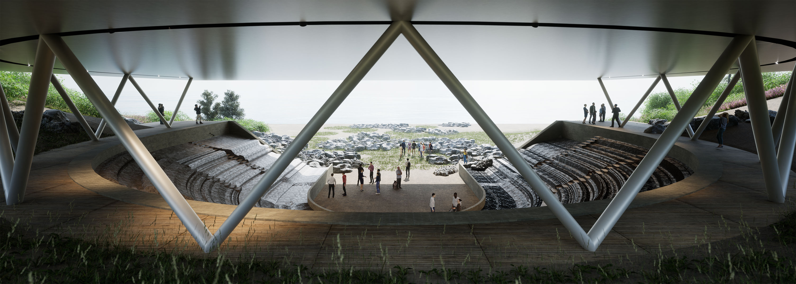 I materiali proposti per la copertura sono principalmente due. L’estradosso è rivestito in lamiera aggraffata di zinco-rame-titanio. Si tratta di un materiale naturale, ecologico, privo di manutenzione e facilmente adattabile a qualsiasi tipo di forma. Il colore naturale della lamiera è grigio e in quanto metallo ha una capacità di riflessione diffusa in grado generare un dialogo armonioso con il contesto di cielo e mare, in cui si trova immerso il parco archeologico. La grande lastra di intradosso è invece concepita come una superficie monolitica senza soluzione di continuità. L’effetto viene ottenuto mediante la realizzazione di un impalcato in lastre di aquapanel stuccate e lisciate con malta di calce e polvere di marmo tirata a spatola metallica. Si crea cosi una specchiatura omogenea e satinata dove i gradoni del teatro si riflettono generando leggeri riverberi diafani che ne suggestionano la vista.