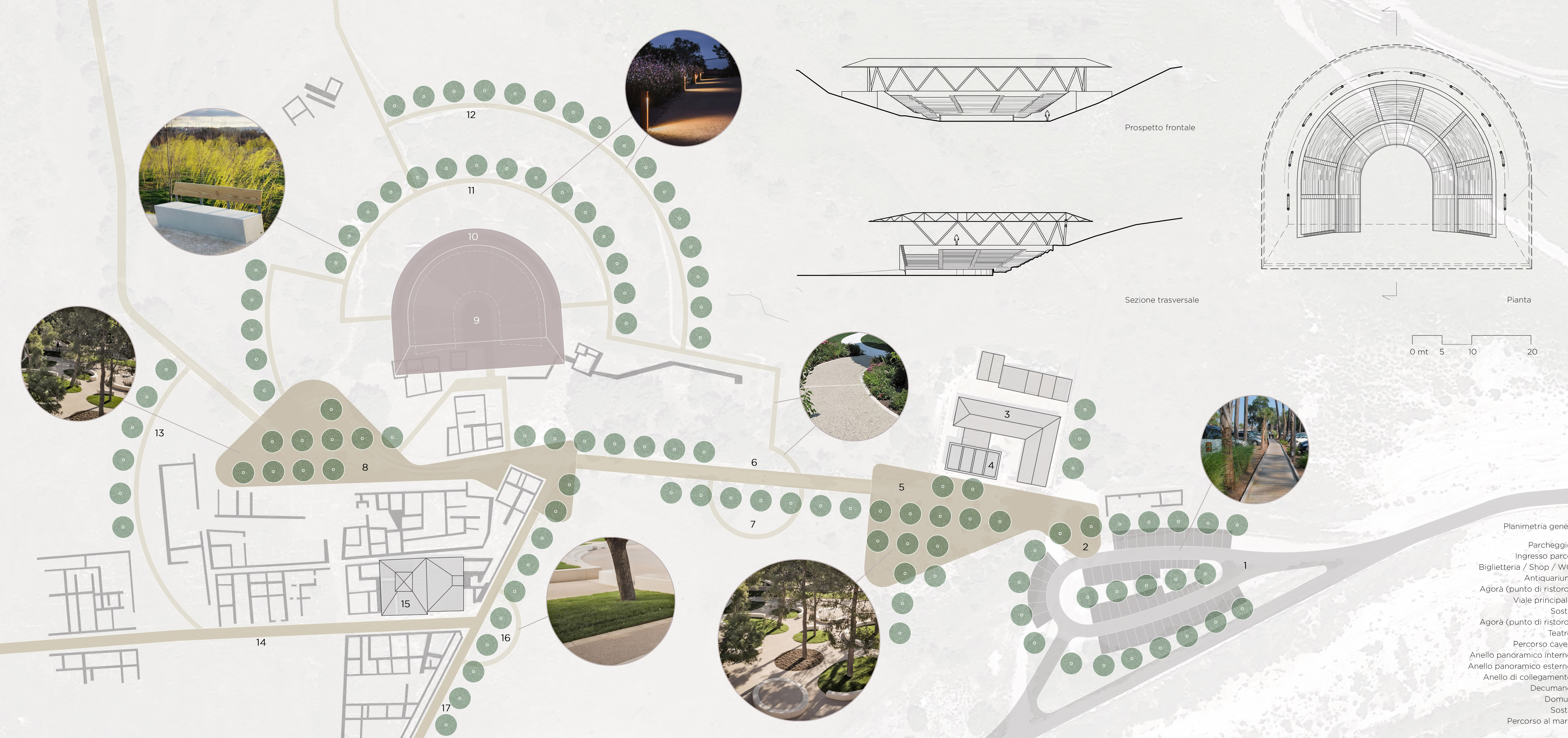 L’intervento di riqualificazione del parco si sviluppa intorno ad uno studio dei percorsi di visita in grado di migliorare la fruizione, l’accessibilità e l’esperienza didattica del visitatore. In primis il progetto potenzia i due assi che ricalcano l’impianto dell’antica città: l’asse Est Ovest che dall’ingresso porta al cuore del parco nel centro dell’area dell’abitato; l’asse Nord –Sud che dal teatro porta al mare attraversando l’abitato. I percorsi si innestato in due Agorà poste all’inizio e alla fine del parco. Si tratta di ampie piazze disegnate da linee poligonali smussate, che si attrezzano con spazi di sosta e di ristoro e si intersecano con un sistema verde di alberature a filare ad alta potenzialità ambientale. Intorno al teatro partono tre percorsi circolari impostati a quote crescenti che innescano dialoghi panoramici tra ambito collinare e rovine archeologiche. Il parcheggio viene ridisegnato ottimizzando fruizione e forma con alberature ombreggianti. Viene infine ridisegnata la zona di ingresso con un ampio dehor innestato sullo spazio veicolare.