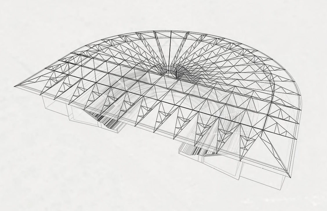 L’idea progettuale consiste nel realizzare una copertura a campata unica con luce massima di 35 mt. L’elemento costruttivo scelto per coprire questa distanza è l’acciaio, declinato sotto forma di profilati tubolari leggeri aggregati secondo opportuni schemi geometrici. La struttura principale è costituita da una trave reticolare spaziale alta circa 1,50 mt e larga circa 7,50 mt, posta in posizione avanzata, al di sopra della parte rettilinea dei gradoni. A questa trave si innestano radialmente una serie di reticolati che coprono la parte semicircolare della cavea. La struttura poi si protende verso il mare con uno sbalzo di circa 7 mt realizzato con una serie di reticolari rastremate collegate alla trave principale. Il bordo della copertura è anch’esso rastremato così da restituire dal basso una vista più esile dell’intero impalcato.