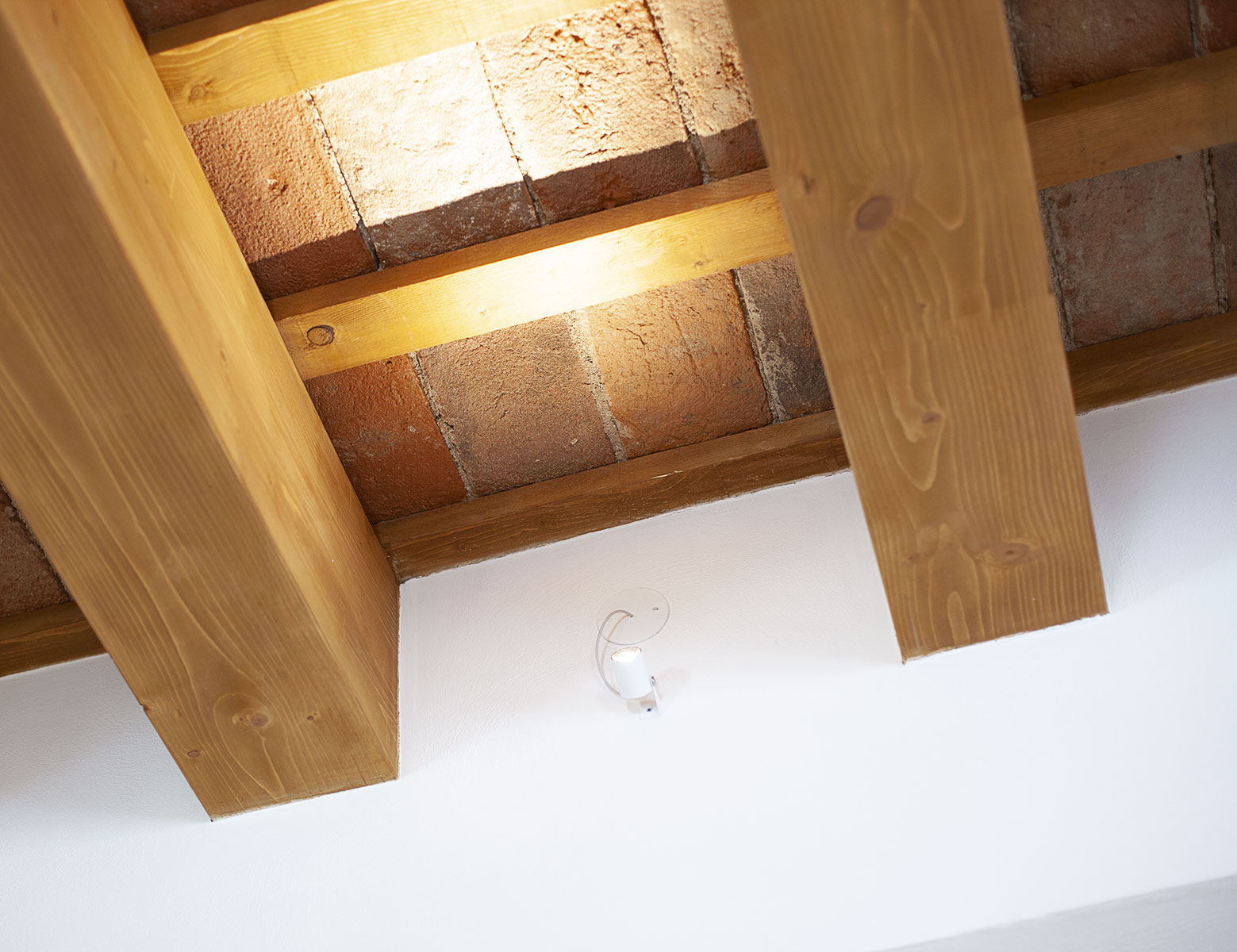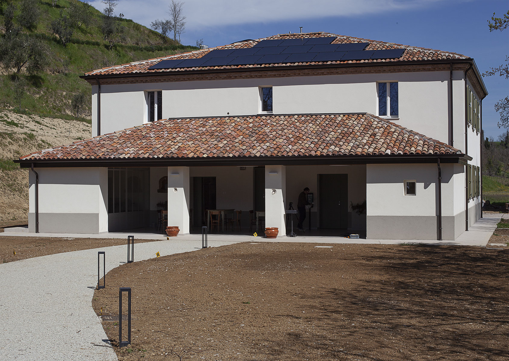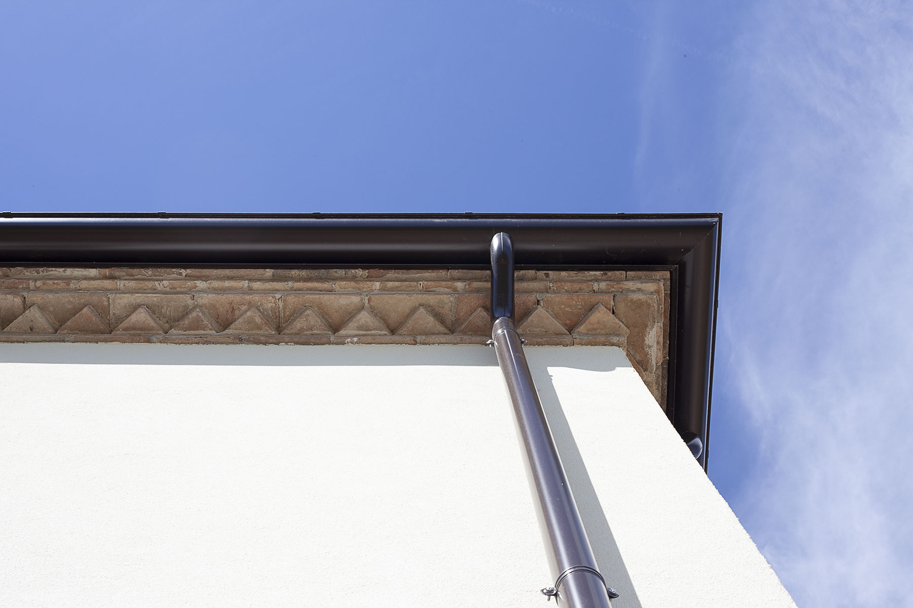 Le coperture vengono rispettate in materia e forma. L’adeguamento strutturale delle travature lignee e il miglioramento delle prestazioni termiche comportano un inspessimento del pacchetto di copertura che rispettando le quote di intradosso dell’esistente ne modifica la quota estradossale. I cornicioni esistenti in mattoni laterizi sagomati vengono smontati e ricomposti alla nuova quota di imposta del tetto, preservandone così la valenza estetica. Sulla falda di Est del fabbricato sono inseriti due nuovi lucernai al fine di incrementare gli apporti luminosi dei servizi sottostanti. Sulla falda di Sud trovano alloggio i pannelli fotovoltaici posati secondo uno schema che asseconda la geometria dell’impalcato. Il portico subisce una lieve modifica nella pendenza al fine di poter ospitare i giusti spessori di isolamento senza andare ad interferire con le banchine delle finestre di piano primo.