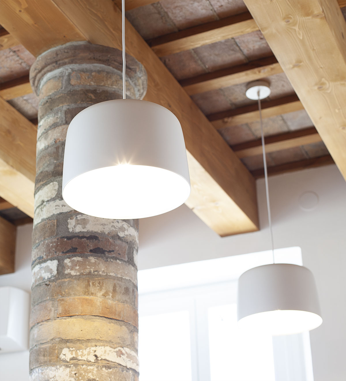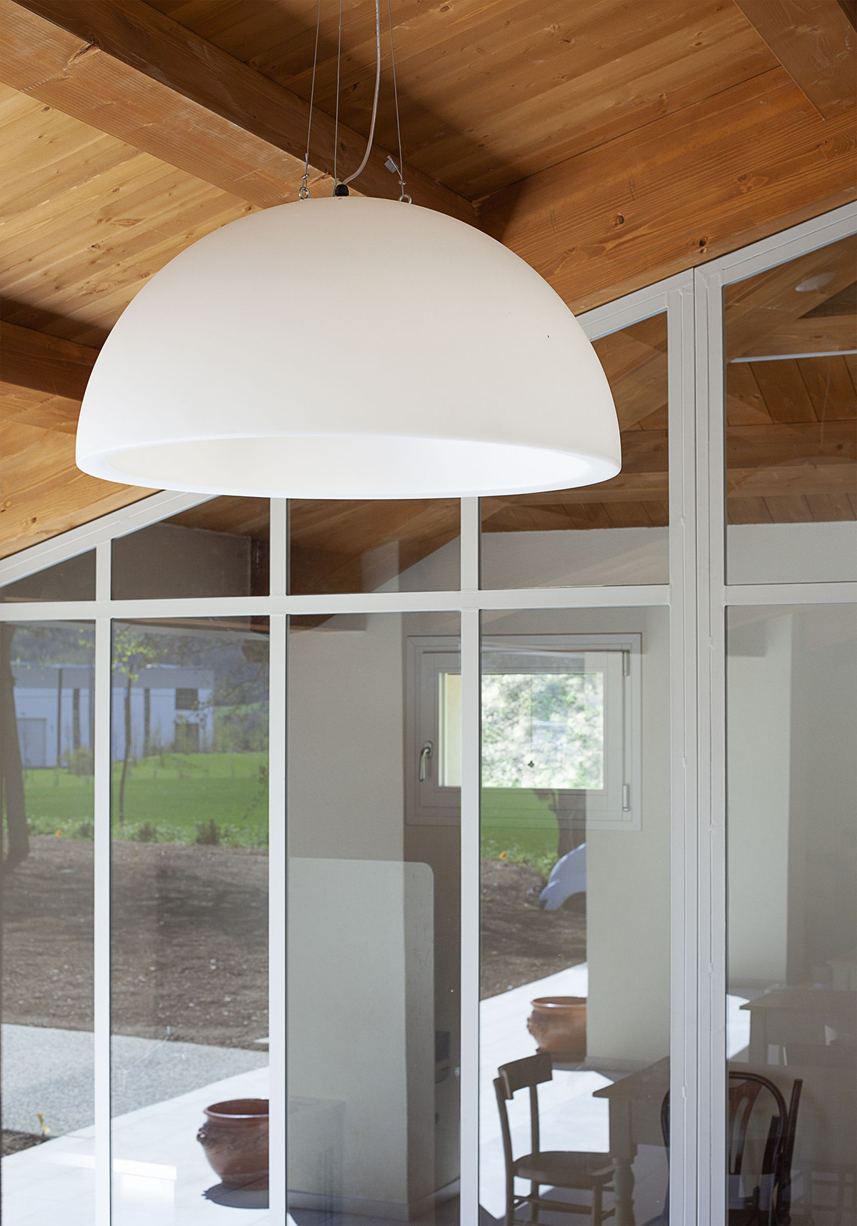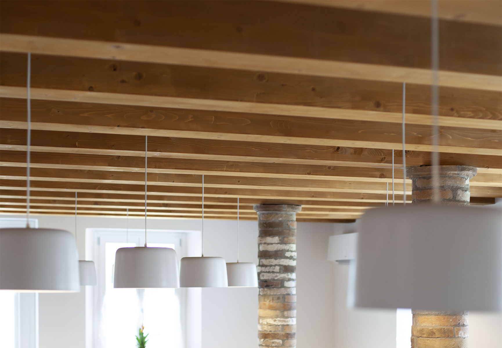 Le coperture vengono rispettate in materia e forma. L’adeguamento strutturale delle travature lignee e il miglioramento delle prestazioni termiche comportano un inspessimento del pacchetto di copertura che rispettando le quote di intradosso dell’esistente ne modifica la quota estradossale. I cornicioni esistenti in mattoni laterizi sagomati vengono smontati e ricomposti alla nuova quota di imposta del tetto, preservandone così la valenza estetica. Sulla falda di Est del fabbricato sono inseriti due nuovi lucernai al fine di incrementare gli apporti luminosi dei servizi sottostanti. Sulla falda di Sud trovano alloggio i pannelli fotovoltaici posati secondo uno schema che asseconda la geometria dell’impalcato. Il portico subisce una lieve modifica nella pendenza al fine di poter ospitare i giusti spessori di isolamento senza andare ad interferire con le banchine delle finestre di piano primo.