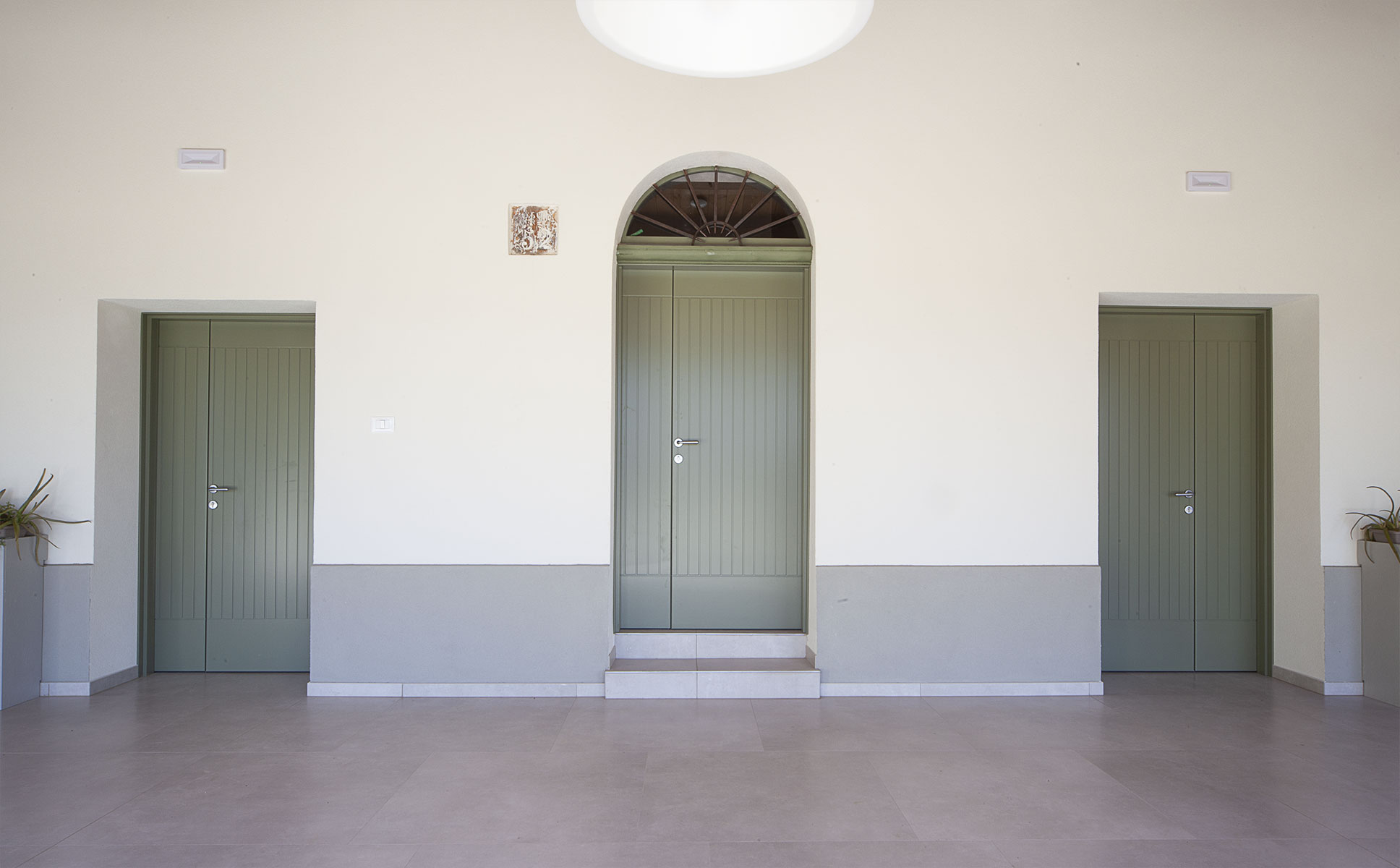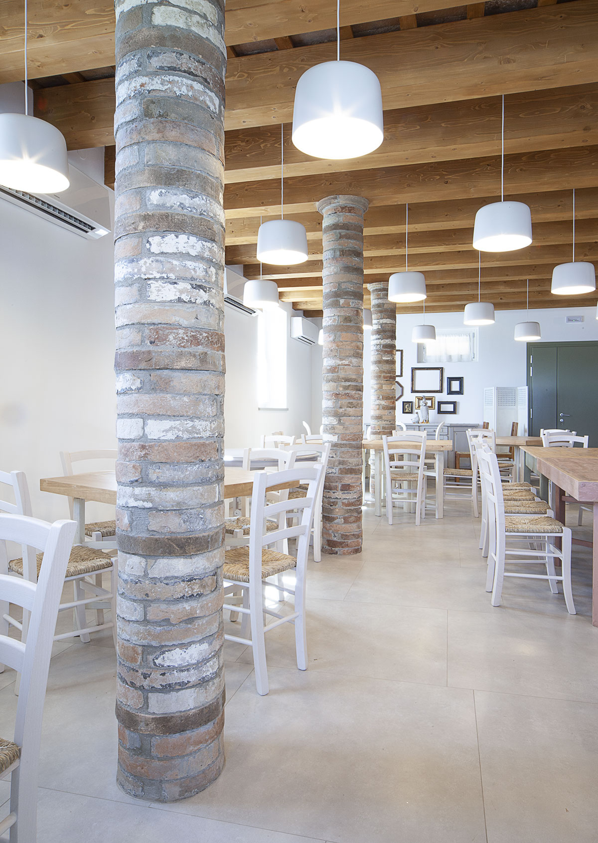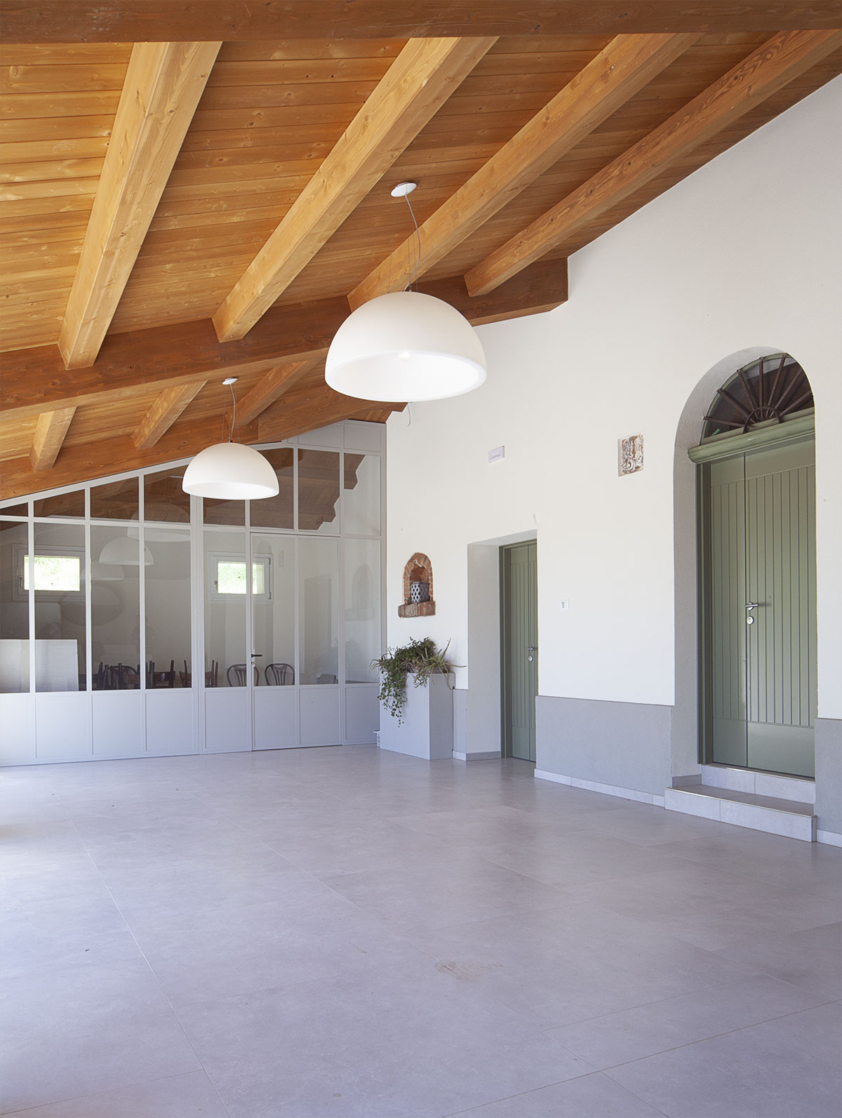 Il portico conserva la sua funzione di spazio aperto coperto, fungendo da anticamera di ingresso alla sala ristorante dalla quale si accede tramite un’ampia apertura posta sulla sinistra. A destra vi è l’accesso alla dispensa. In posizione centrale viene conservata la porta di ingresso all’antica abitazione della scala è posta la cucina confermando l’antica destinazione del vano che la ospita. Si conservano le tamponature esistenti presenti nelle campata ad angolo del portico e viene preservata anche la presenza dei vani lato Est che unificati in un unico ambiente costituiranno un secondo vano al servizio al ristorante.
