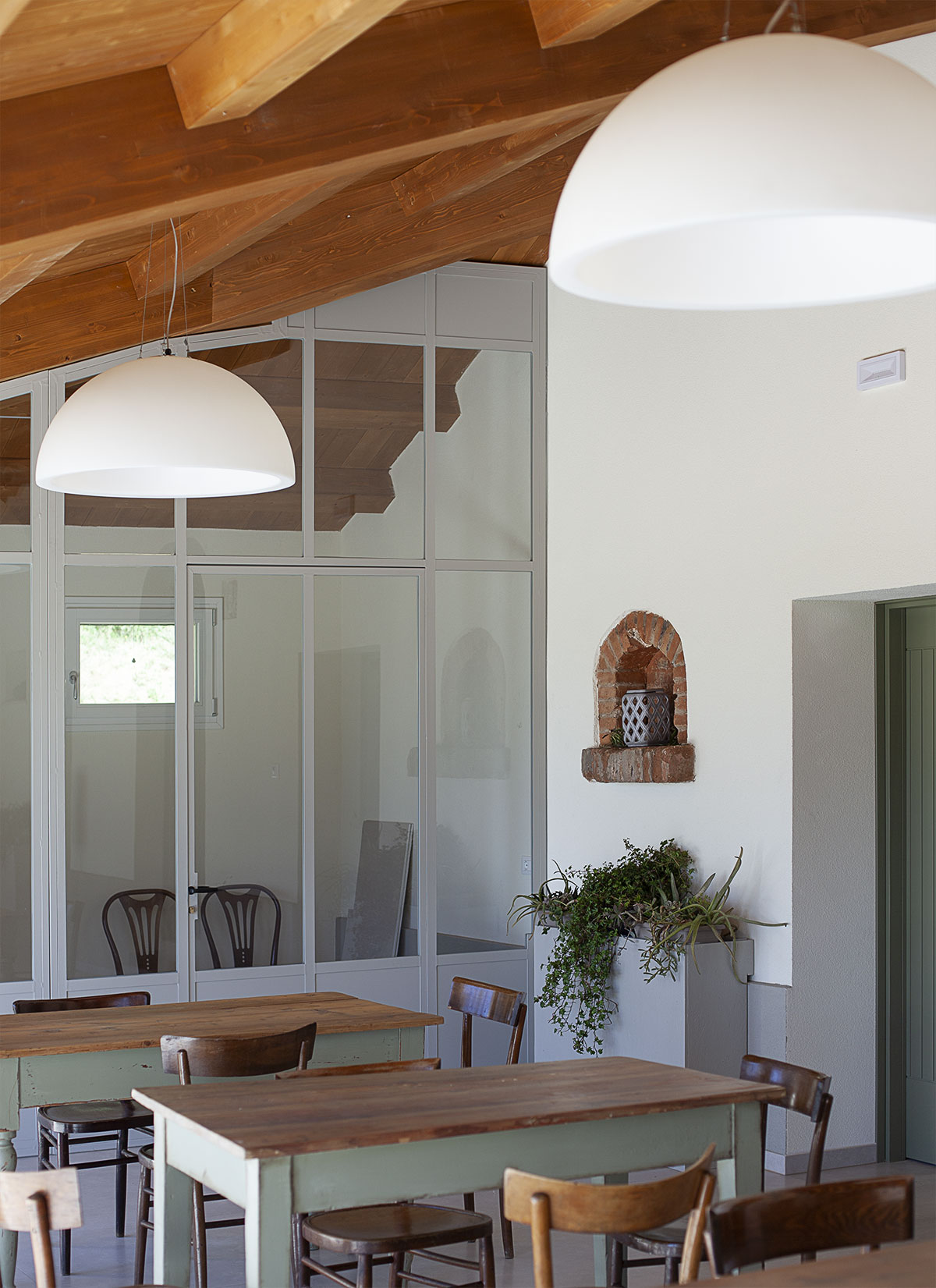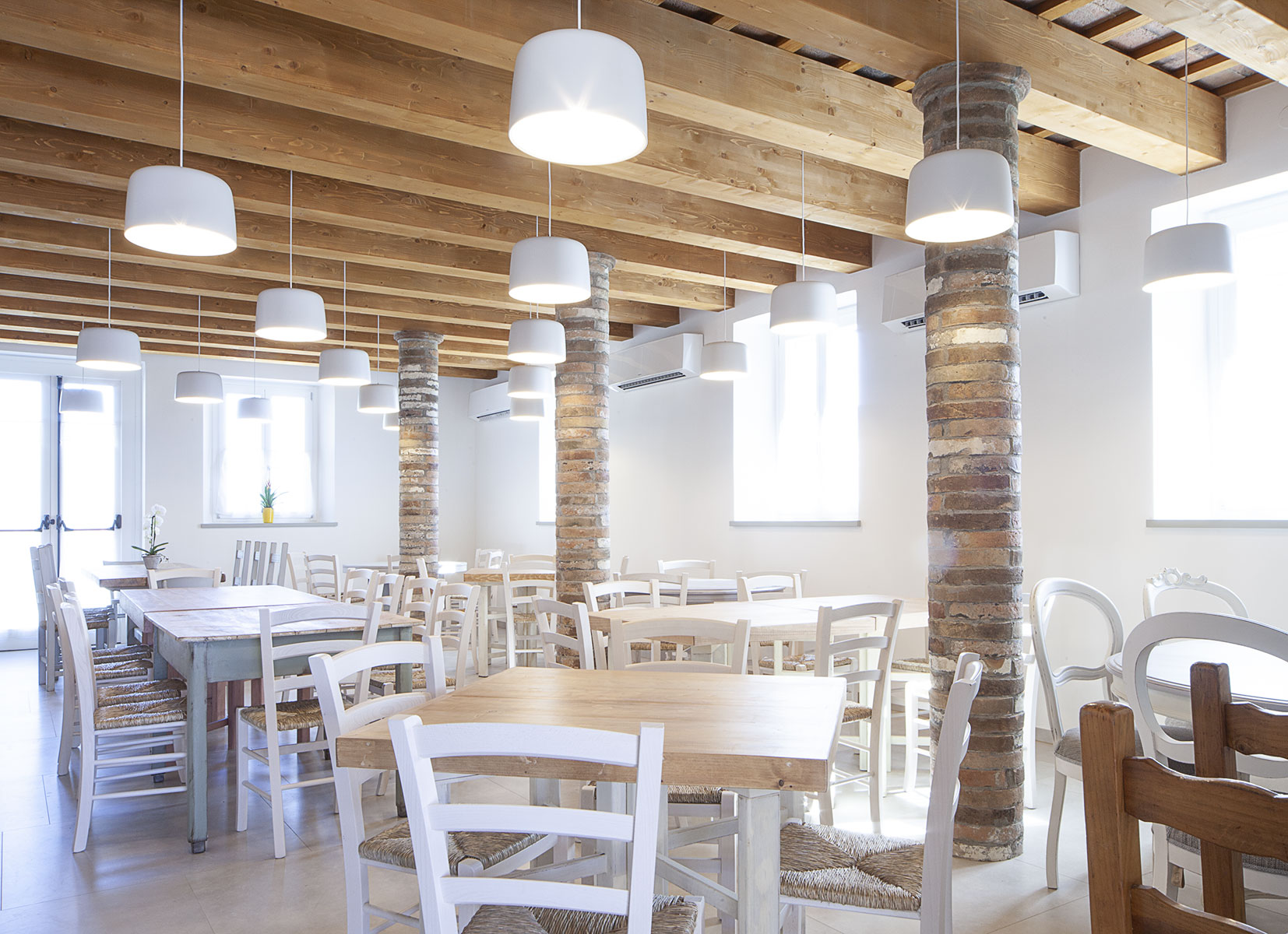 Il progetto architettonico prevede il cambio di destinazione d’uso da residenza ad agriturismo. Il piano terra che storicamente prevedeva la collocazione dei vani di ricovero per bestie e animali, proprio per l’ampio taglio delle sue stanze viene adibito a ristorante. La scala posta al centro del fabbricato viene conservata in forma e struttura e rappresenta la naturale divisione tra gli spazi aperti al pubblico e i vani per gli addetti alla ristorazione. A destra della scala si trova la grande sala di somministrazione, punteggiata sul lato dalla presenza di tre colonne in mattoni che ne arricchiscono la composizione. A sinistra della scala attraverso un vano adibito a dispensa si arriva agli spogliatoi con relativi servizi e infine alla cucina del ristorante. La zona oltre le scale e in parte il sottoscala vengono adibiti a servizi igienici per il pubblico.