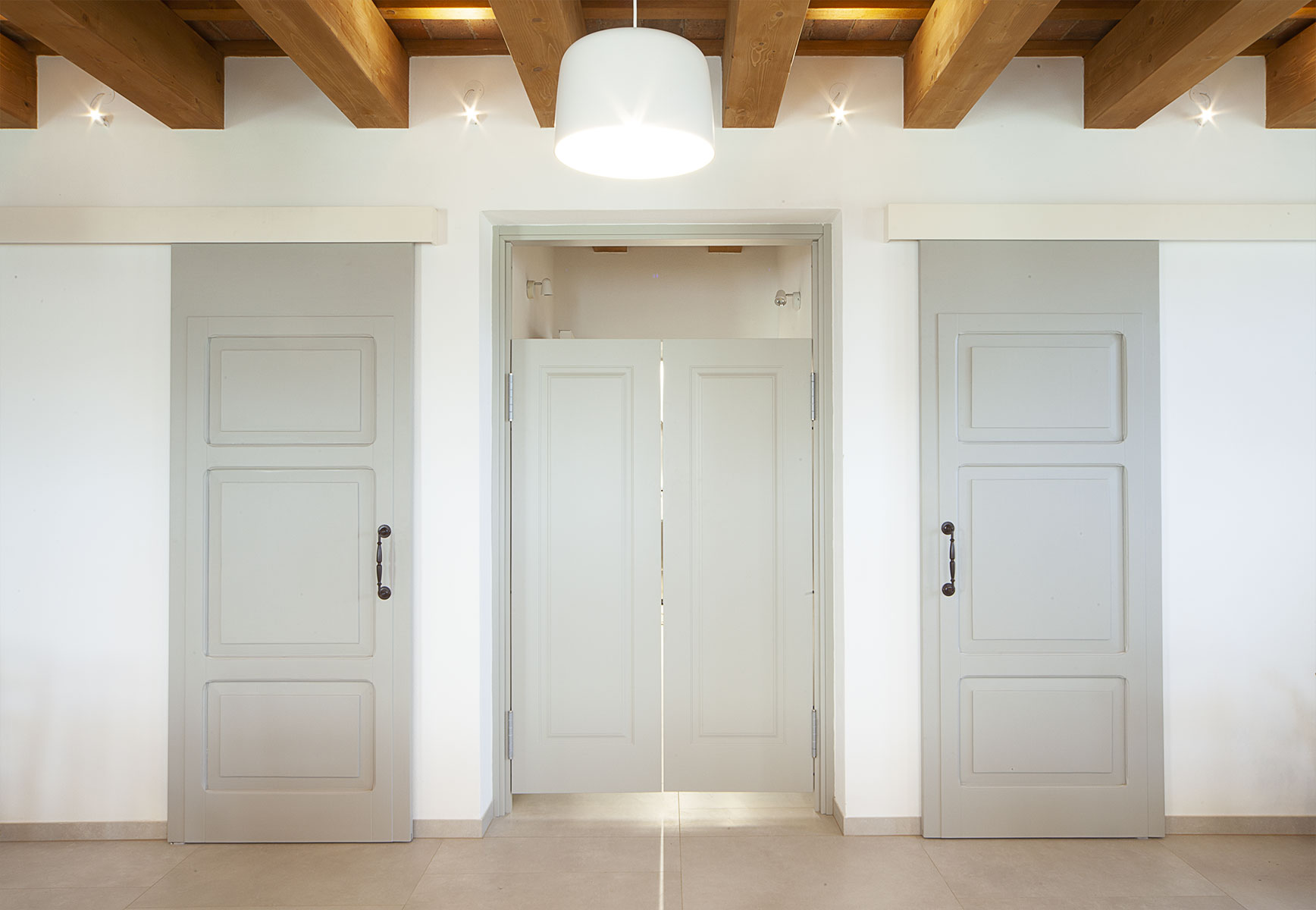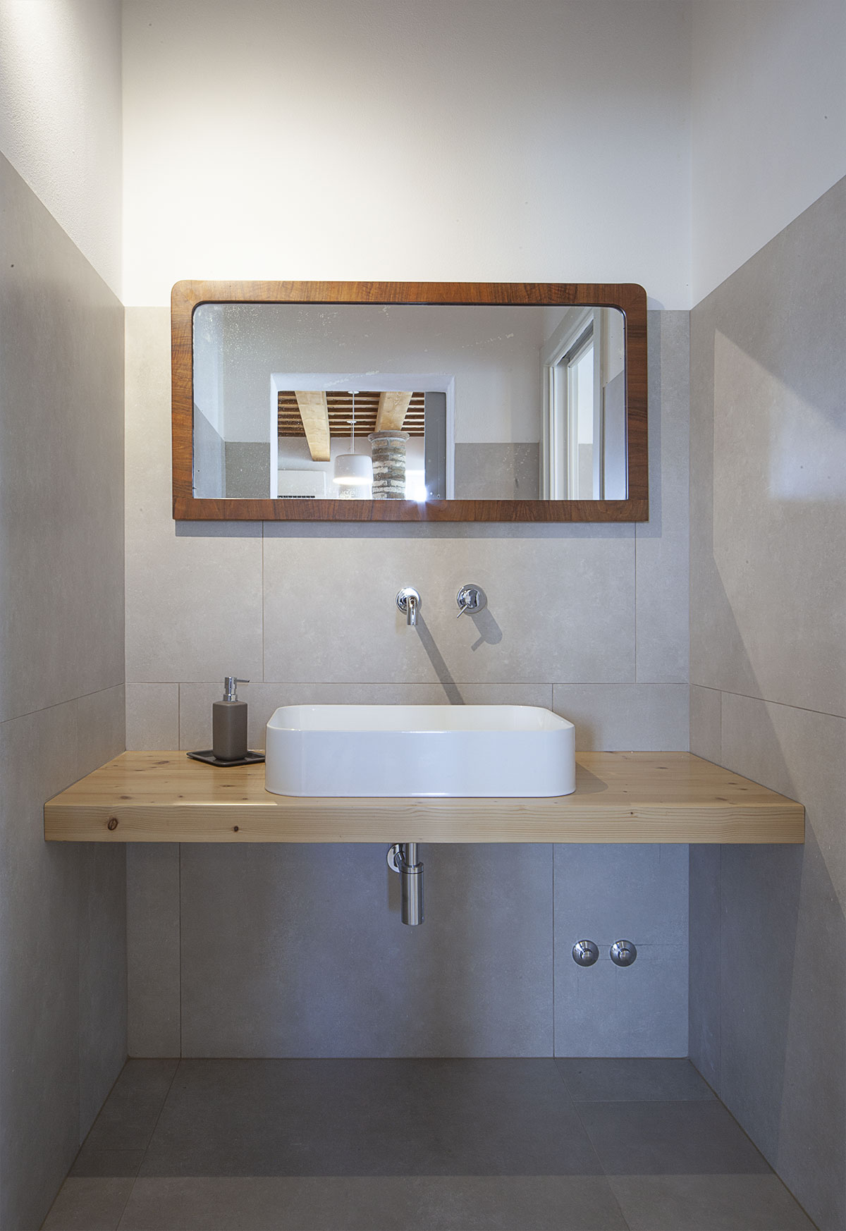 Il piano primo viene destinato all’ospitalità. Nel rispetto dell’impianto originario, sono ricavate quattro camere poste ai quattro angoli del fabbricato, alle quali si accede tramite un ampio disimpegno simmetrico rispetto all’asse longitudinale della scala. Ogni camera è stata ridimensionata al fine di migliorarne il rapporto di illuminazione e di ricavare un servizio igienico di pertinenza.