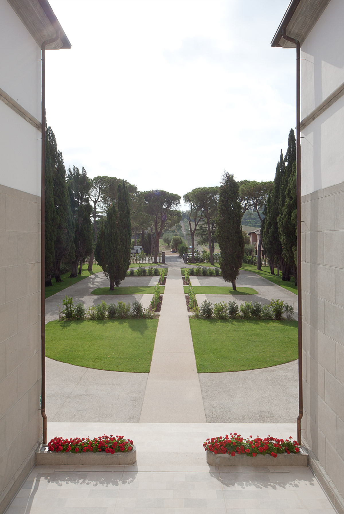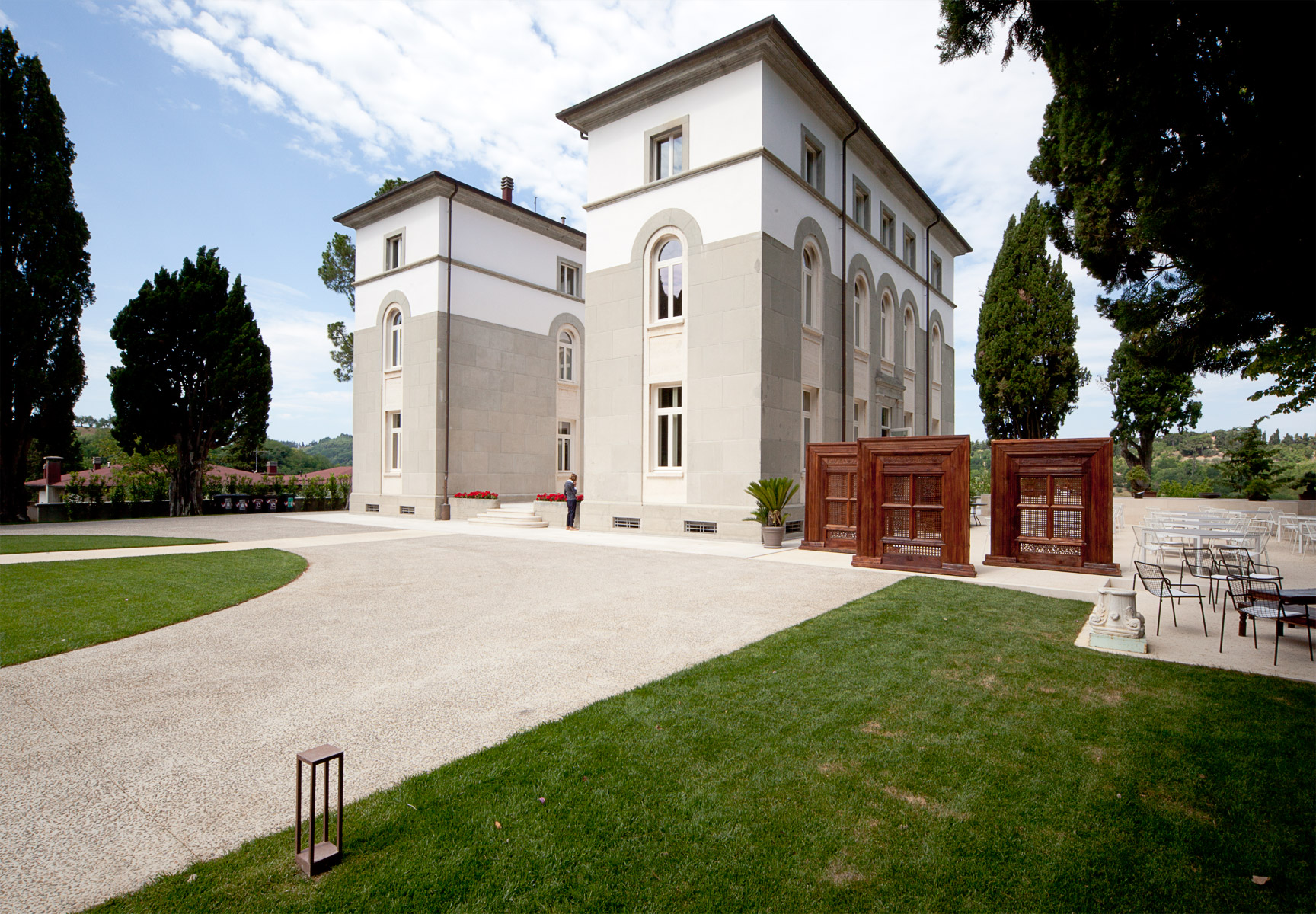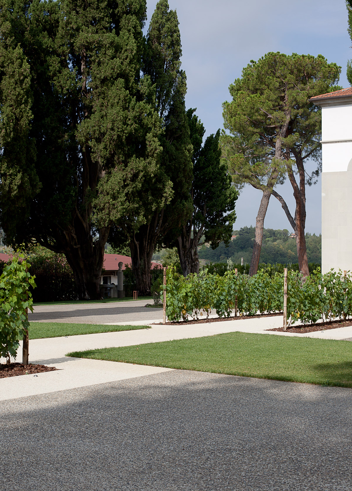 Il progetto architettonico ha previsto in primis una semplice operazione di sottrazione attraverso la rimozione di tutti gli arbusti presenti nel parco al fine di valorizzare il suggestivo impianto a filari dei cipressi perimetrali. Viene conservato l’impianto originale dei viali a disegno ovoidale che dall’ingresso portano alla villa. La loro vocazione è principalmente carrabile. Il sistema dei percorsi viene ampliato con la formazione di una lunga passerella pedonale posta in posizione centrale, in asse con la villa. Questo permette al visitatore di avere un avvicinamento frontale alla villa, capace di attivare una macchina prospettica che enfatizza la simmetria del parco e della villa stessa.