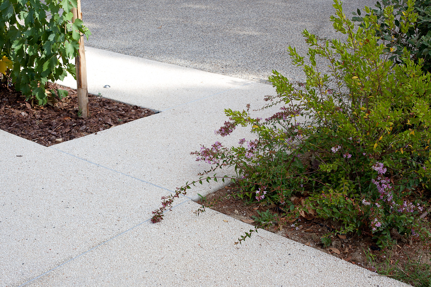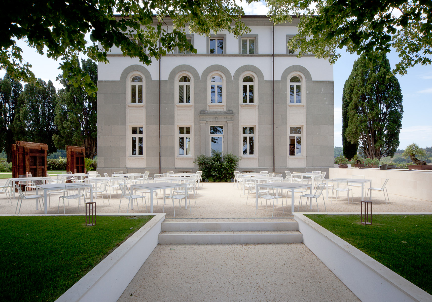 I materiali degli esterni sono principalmente di due tipi. Per i marciapiedi perimetrali e per la piscina sono state utilizzate lastre di pietra beige d’Algerie, pezzatura mista, montato a correre. La pietra usata in prossimità della villa ne completa il portato aulico. In antitesi, al fine di adottare materiali più intonati al contesto rurale, i percorsi pedonali dell’aiuola centrale e il dehors del ristorante, sono realizzati con pavimentazione monolitica con ghiaia a vista nelle tonalità del bianco/avorio. I percorsi carrabili, dello stesso materiale, sono distinti per la cromia virante al grigio.