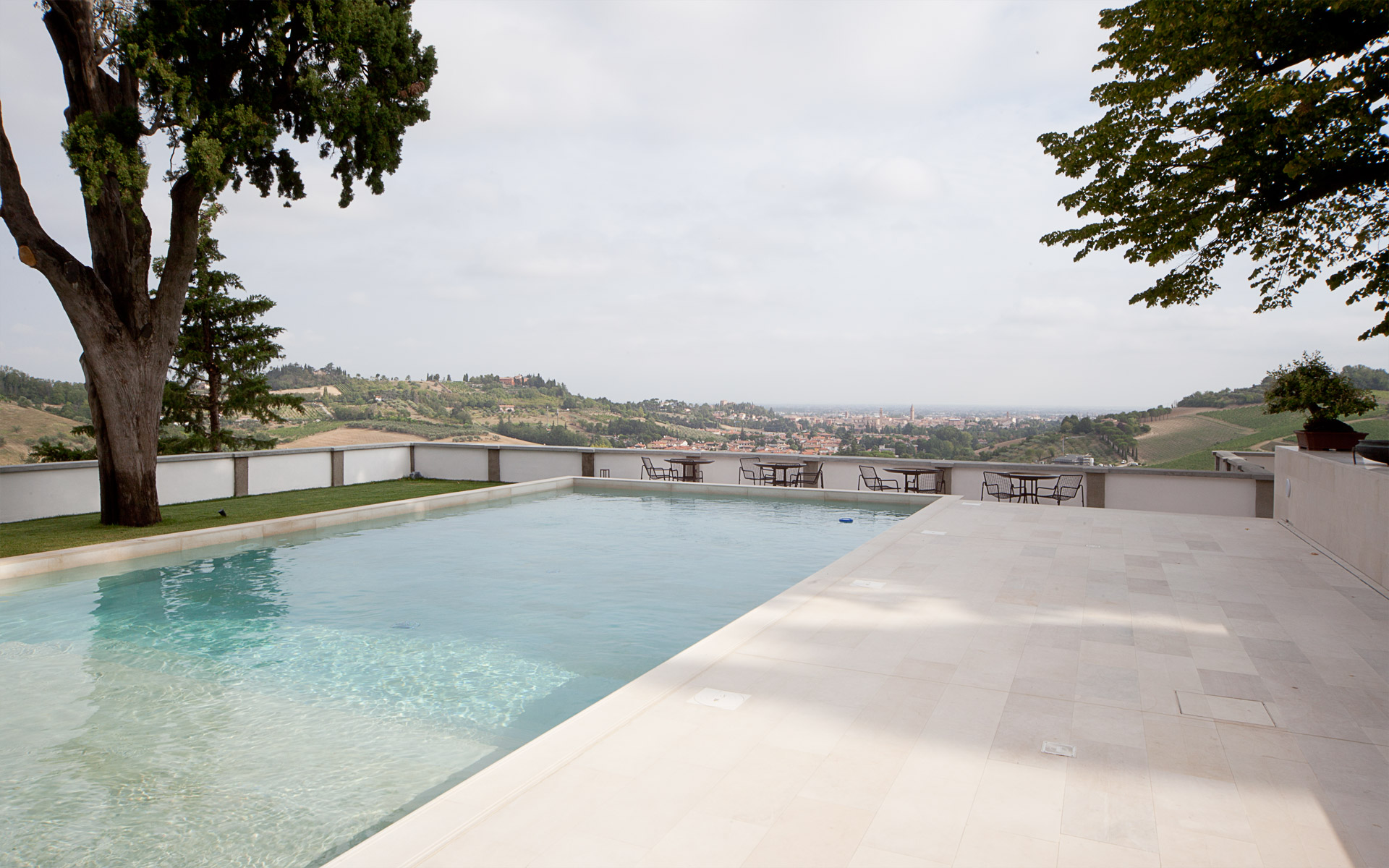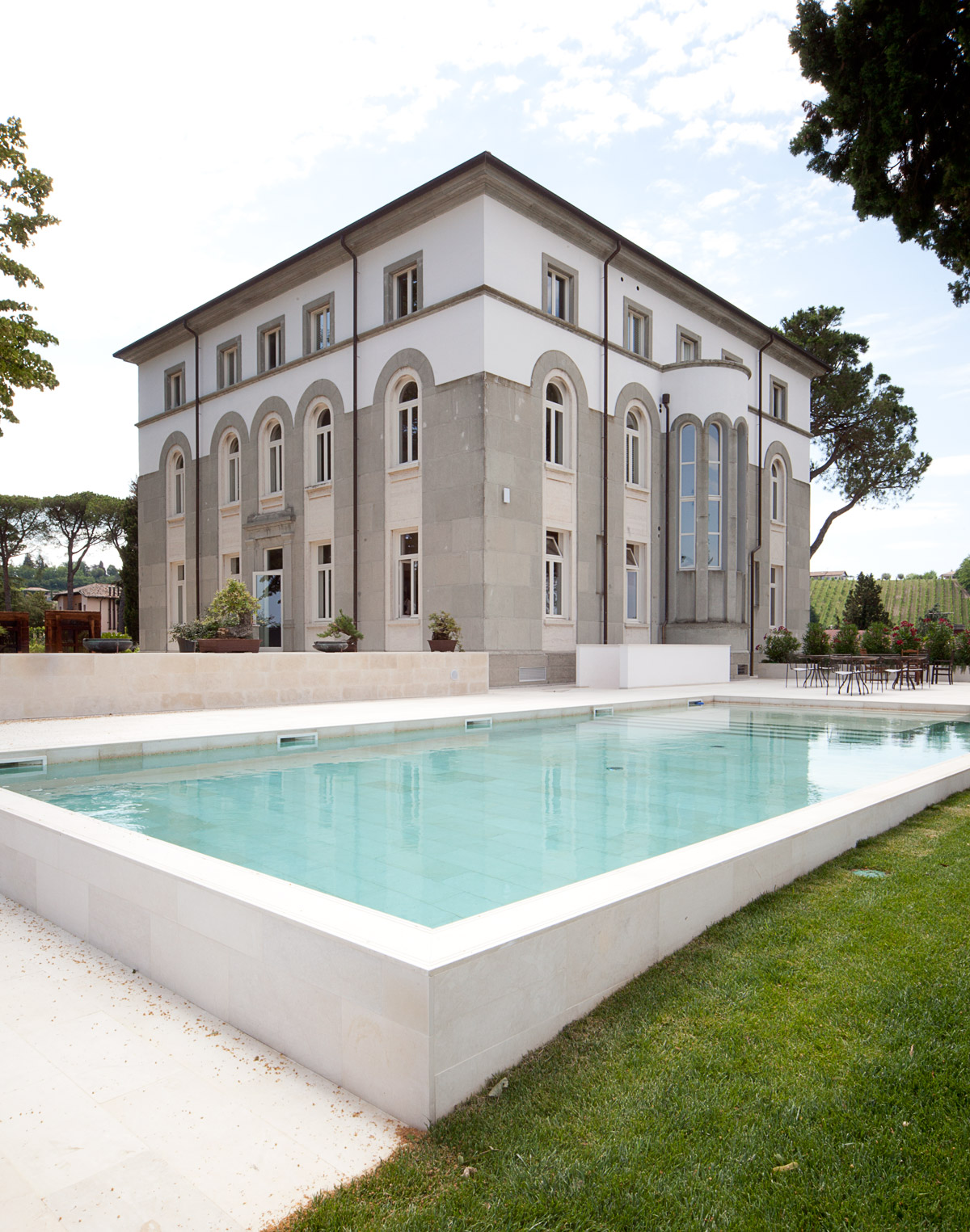 Nell’angolo Nord-Ovest è stata realizzata una piscina rettangolare che gode di una vista speciale, aperta sul panorama a metà tra le colline e la città. Si introduce così nel parco l’elemento “acqua”, prima totalmente mancante, che posto così in prossimità della villa, ne potenzia l’effetto monumentale in un gioco inedito di riflessi e specchiature.