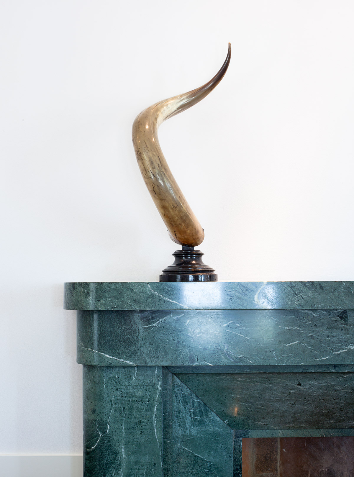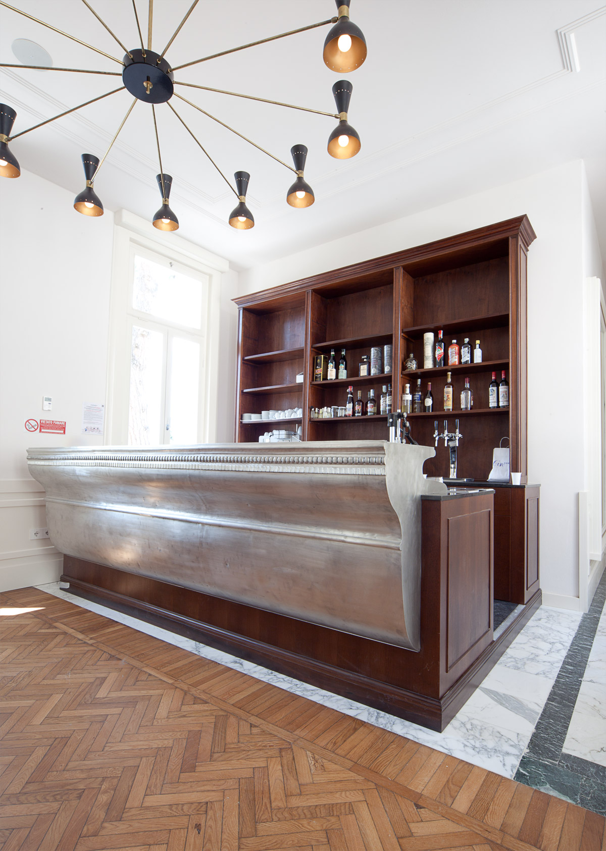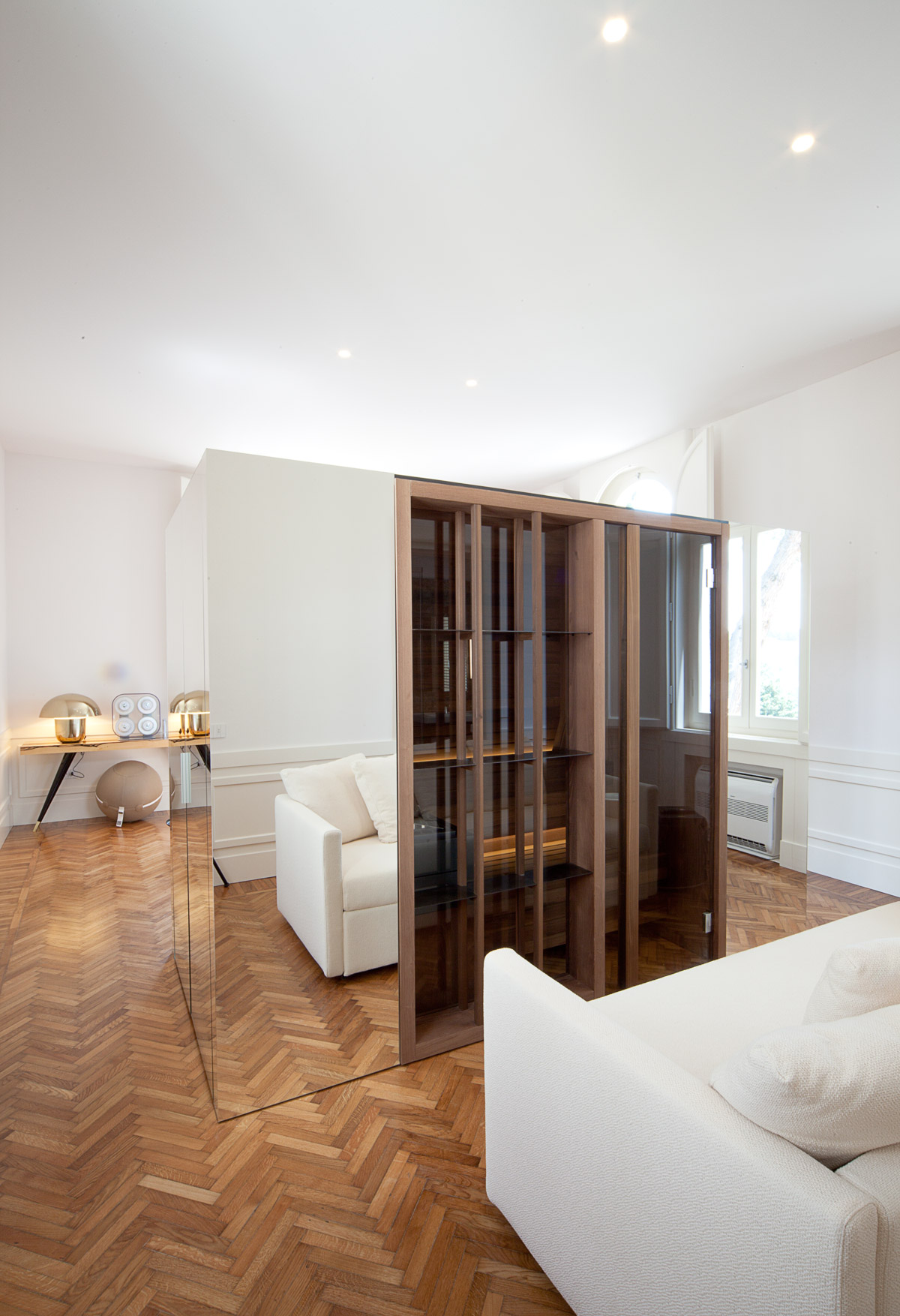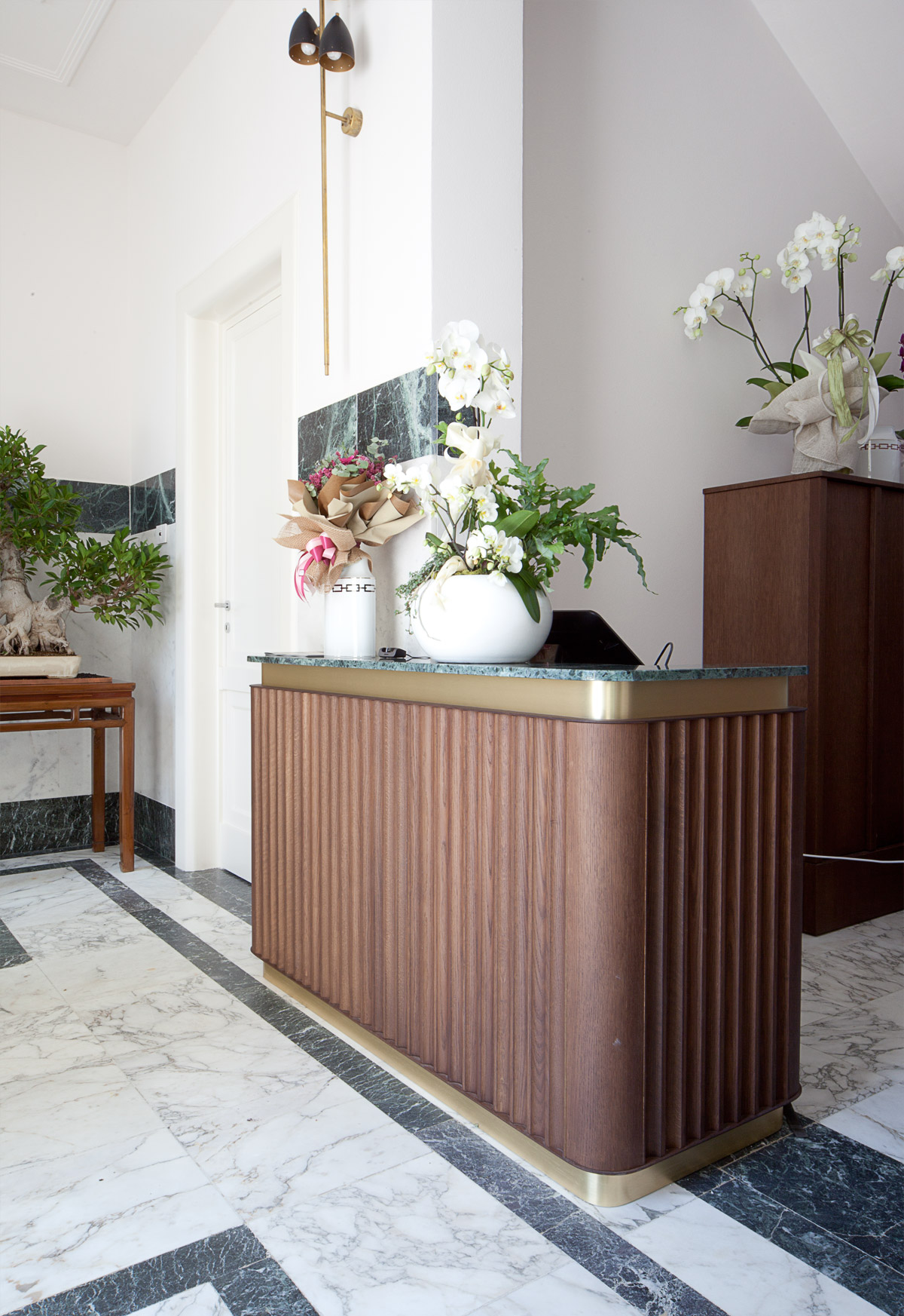 Per la reception posta all’ingresso della villa abbiamo disegnato un mobile a consolle, in legno e marmo. È un piccolo parallelepipedo con gli angoli smussati a ricalcare l’esatta curvatura degli imbotti di porte e finestre esistenti. Il fronte del mobile è costituito da una pannellatura di rovere massello decorato con preziosa scanalatura a sezione curvilinea. Due fasce in ottone marcano la base e la sommità. Il piano è una lastra di marmo verde a richiamare gli inserti dello stesso marmo presenti nello scalone vicino.