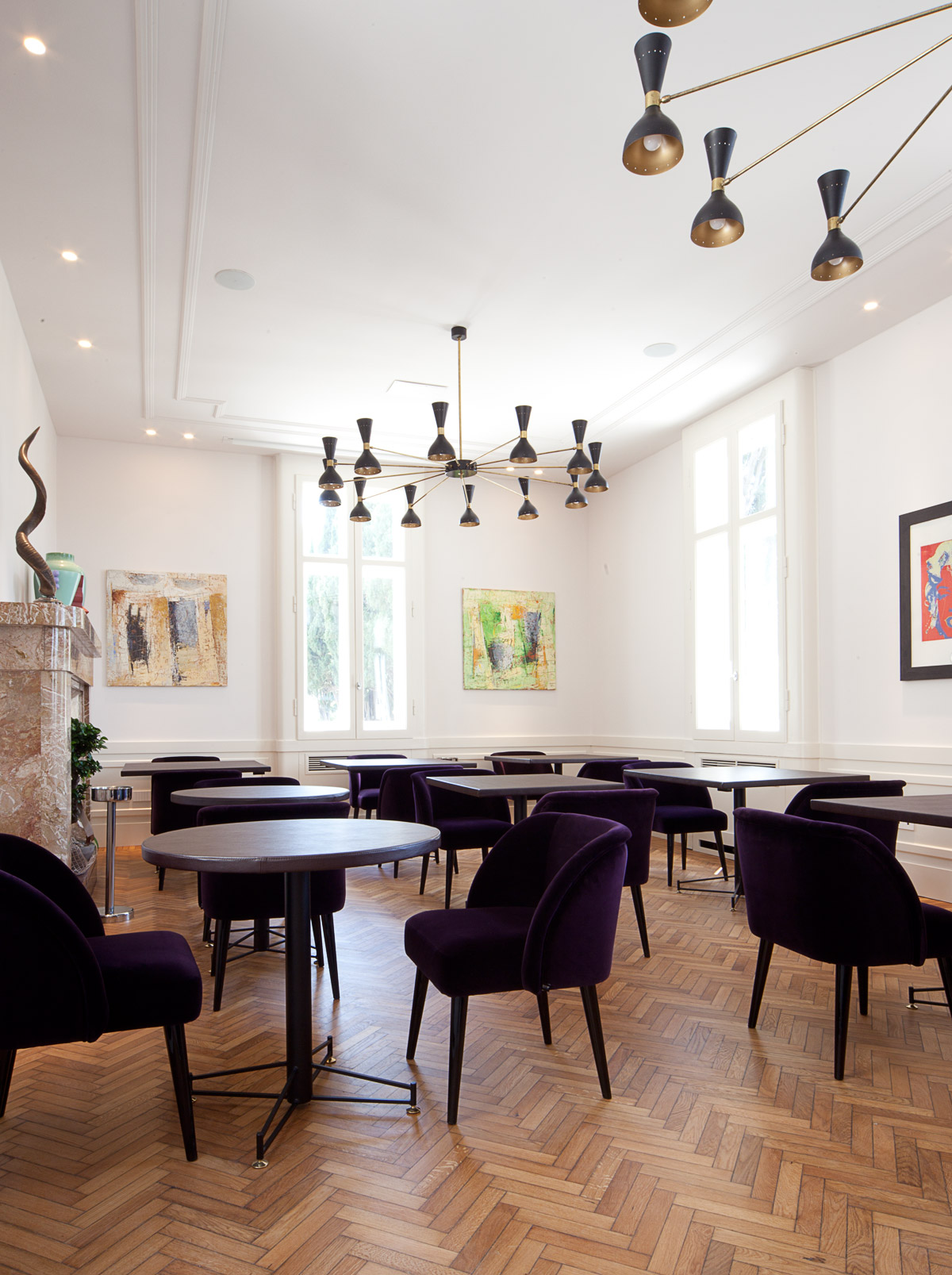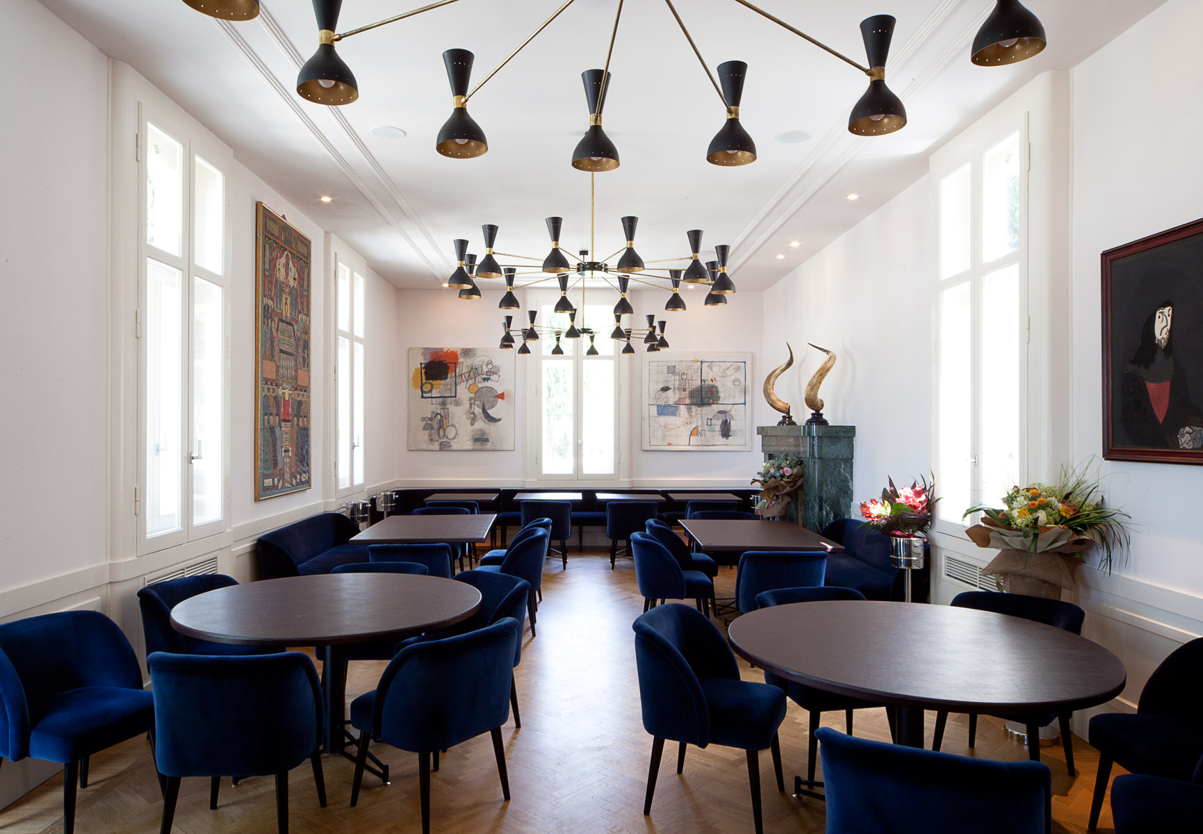 Il piano terra recupera ed estende la sua funzione conviviale originaria. Il grande ambiente dell’avancorpo di Nord viene adibito a sala ristorante con cucina a vista delimitata dalla coppia di pilastri che ne ripartisce la lunghezza. L’avancorpo di Sud è occupato da una seconda sala per colazioni e pranzi, leggermente ampliata annettendo il piccolo vano adiacente. I servizi igienici vengono conservati nella loro posizione originale.