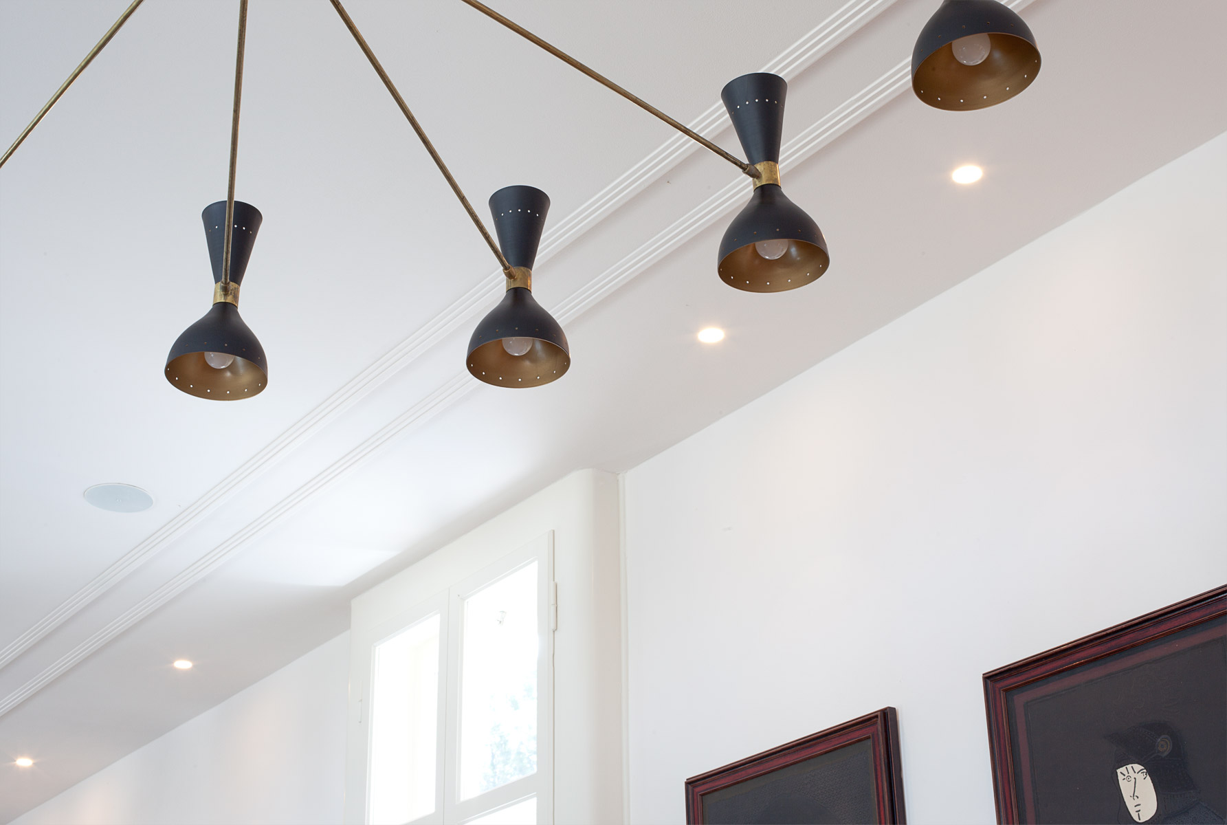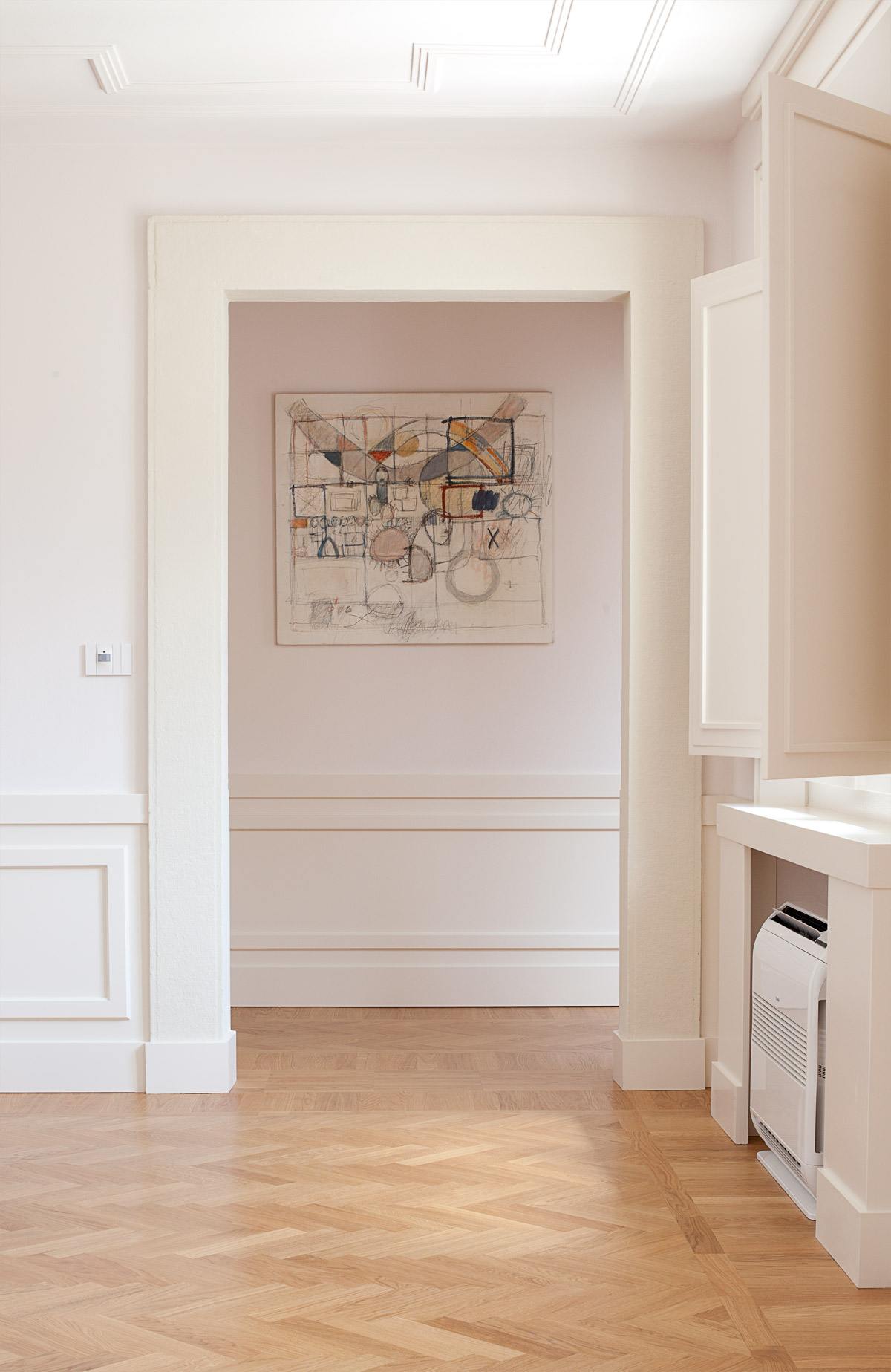 Il progetto si propone dunque di completare questo incompiuto apparato decorativo con la formazione di un “lambris”, ossia una pannellatura in legno verniciato ad altezza davanzale che corre lungo i muri delle stanze congiungendo finestra a finestra, finestra a porta. Questa pannellatura ha semplici decori che riprendono le linee delle imbotti esistenti: uno zoccolo di base, una fascia sommitale ed una cornice a cassettone centrale. Questo semplice inserto conferisce una raffinata unitarietà agli ambienti interni che finalmente trovano una nuova finezza. La decorazione prosegue a soffitto, negli ambienti principali, con l’applicazione negli ambienti principali di cornici perimetrali a formare una greca a quadrato negli angoli.