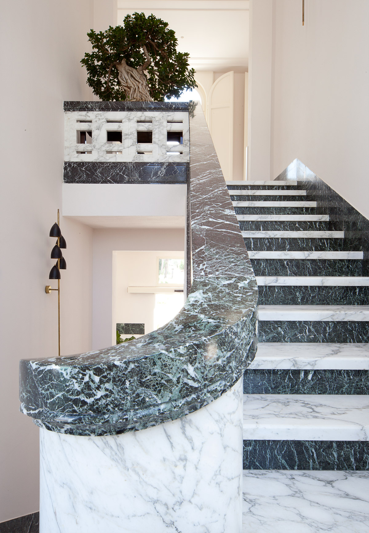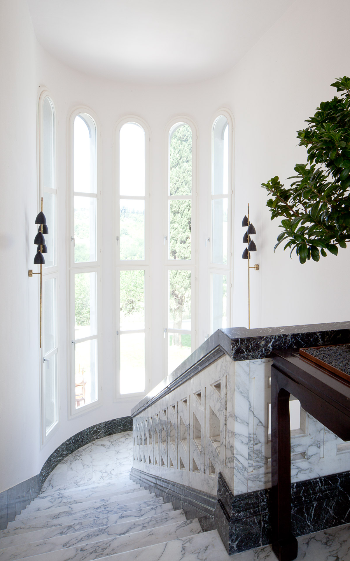 Elemento architettonico di alto valore estetico e pregiata fattura è sicuramente lo scalone a due rampe che porta dal piano terra al piano primo. Localizzato a ridosso dell’abside, è realizzato in bicromia di marmi bianco Arabescato Vagli e marmo Verde Alpi. La balaustra colpisce per il suo corposo spessore in massello di marmo traforato con decori quadrangolari.