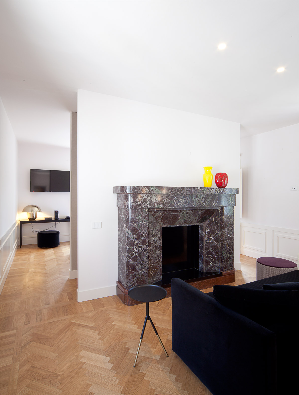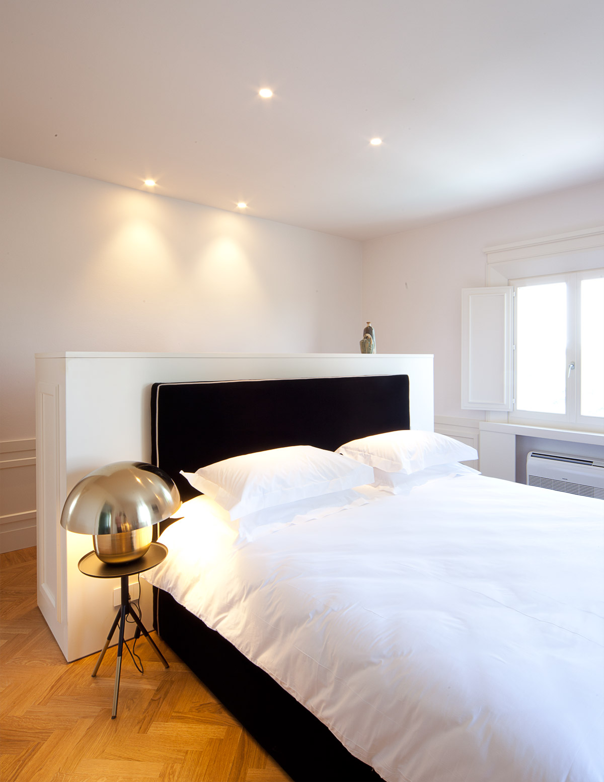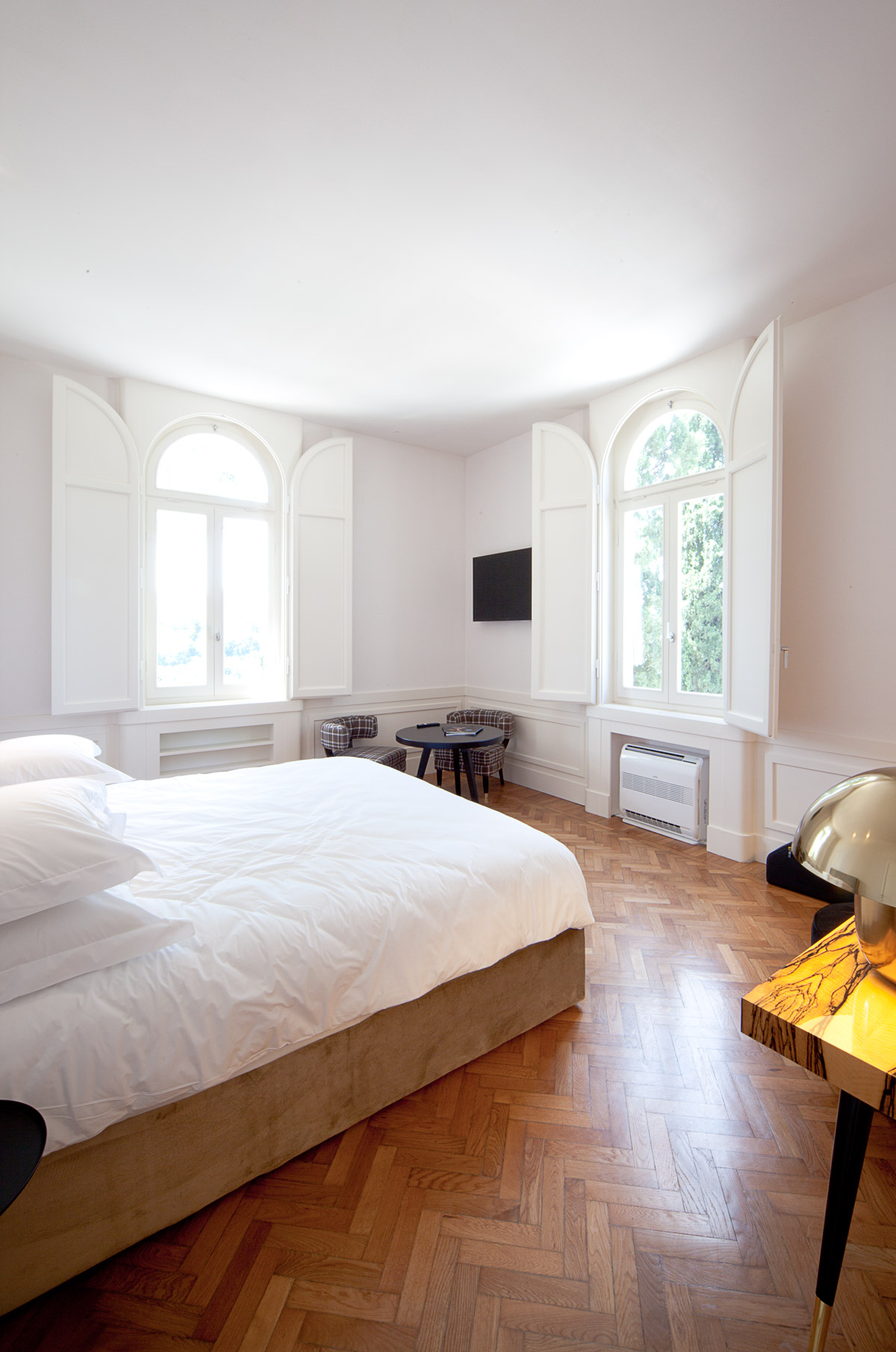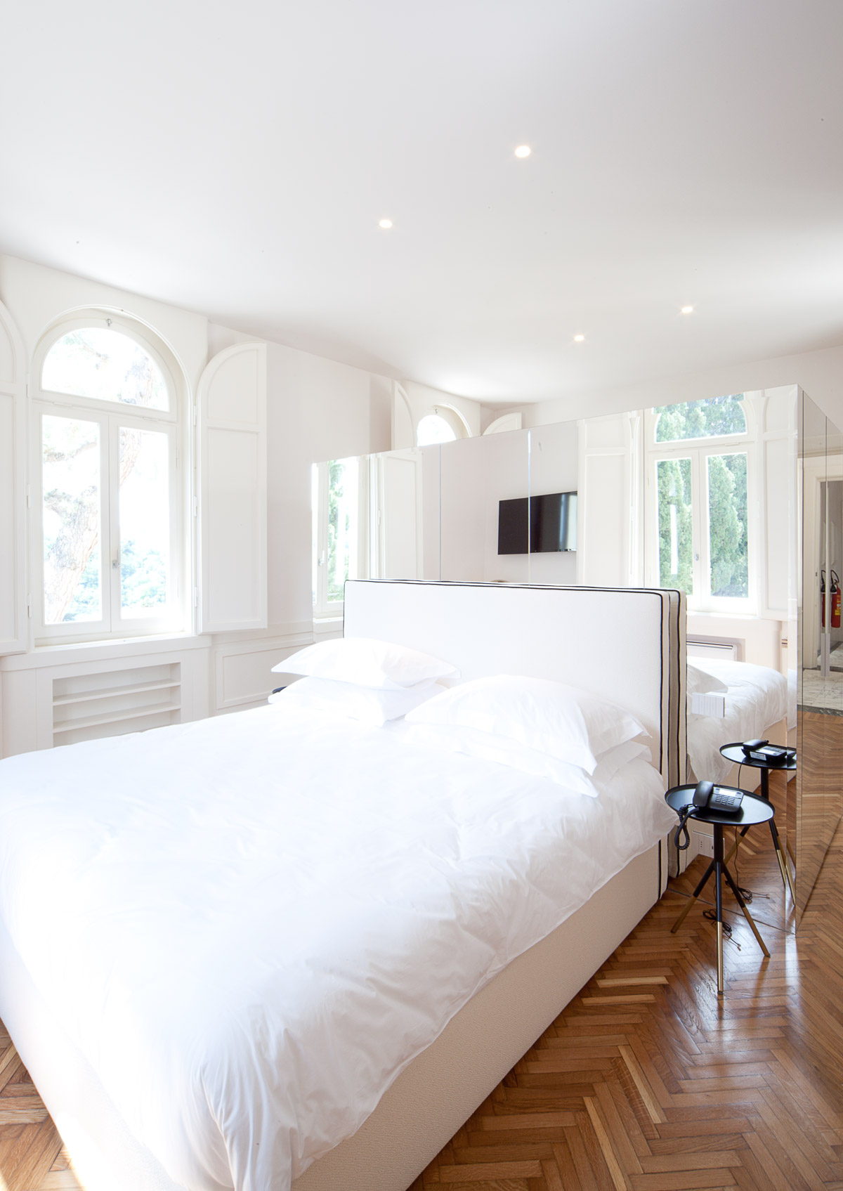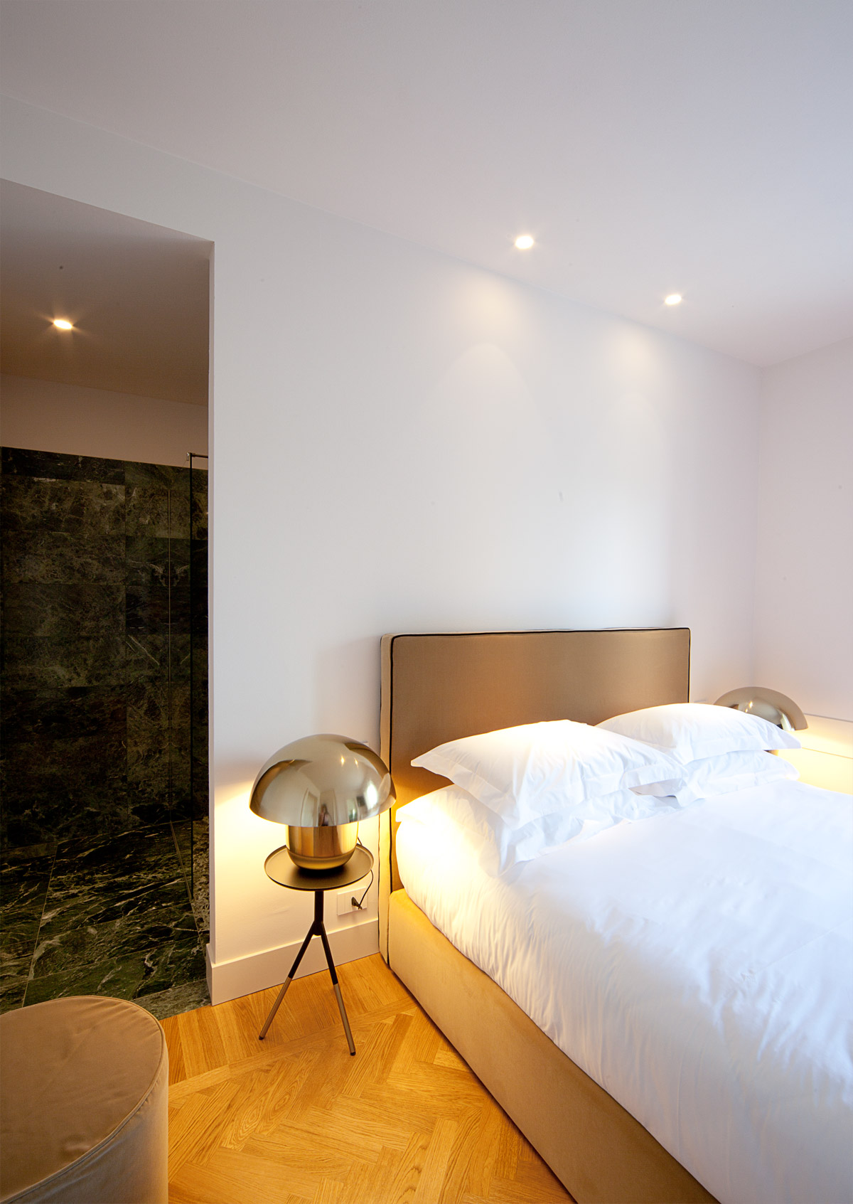 Il progetto di ospitalità è incentrato sul rispetto della destinazione d’uso originale della villa ossia una abitazione signorile caratterizzata dal taglio piuttosto ampio dei suoi ambienti interni. Questo si traduce nella progettazione di camere dalle generose metrature, servite da bagni prodighi di metri quadrati. La distribuzione degli arredi interni prevede talora la formazione di setti divisori in cartongesso, per sfruttare al meglio la spaziosità dei vani. Nella suite di piano primo posta sul lato Sud, viene posizionata a centro stanza una ”private Spa” concepita come una teca in vetro e legno. Questo piccolo centro benessere rappresenta all’interno della abbondante volumetria della stanza, un elemento di separazione con la zona notte, pur mantenendo la percezione globale del vano. Il letto è posto a centro stanza, con la testata in appoggio ad una quinta di specchi su cui si innesta la sauna. La suite di piano secondo ospita uno dei tre camini in marmo presenti nella villa, che dal piano terra è stato smontato e rimontato nel nuovo ambiente dove la sua imponenza massiccia esplode in una inedita potenza.