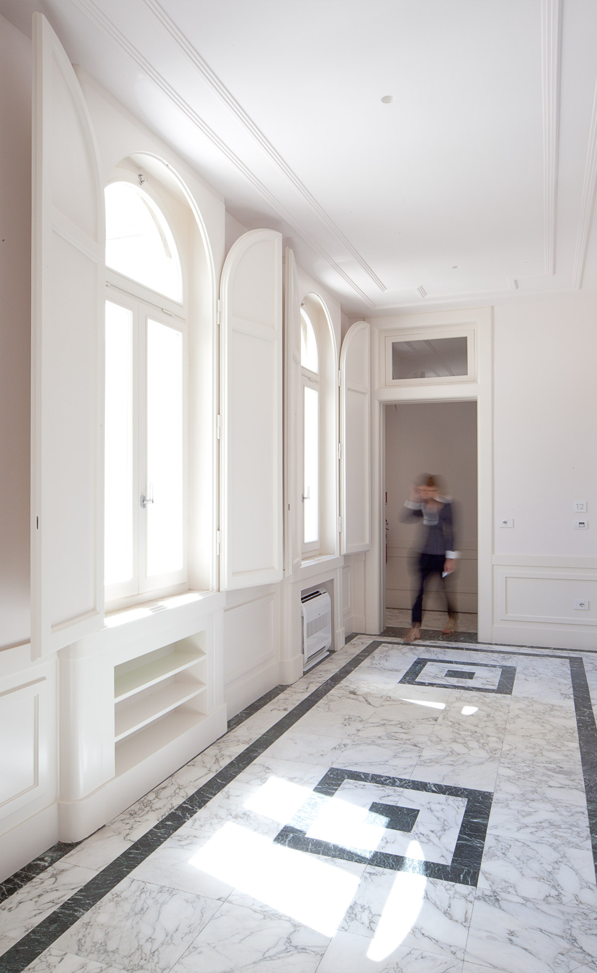 Il progetto ha previsto l’abbandono di queste tonalità per un nuovo apparato cromatico più raffinato che si ispira alle tinte originali: recupero della finitura simil travertino degli imbotti delle finestre mediante rimozione delle tinte superficiali, restauro e verniciatura degli infissi in bianco crema; tinteggiatura in bianco dei fondi di piano secondo; pulizia del bugnato in graniglia grigia del basamento.