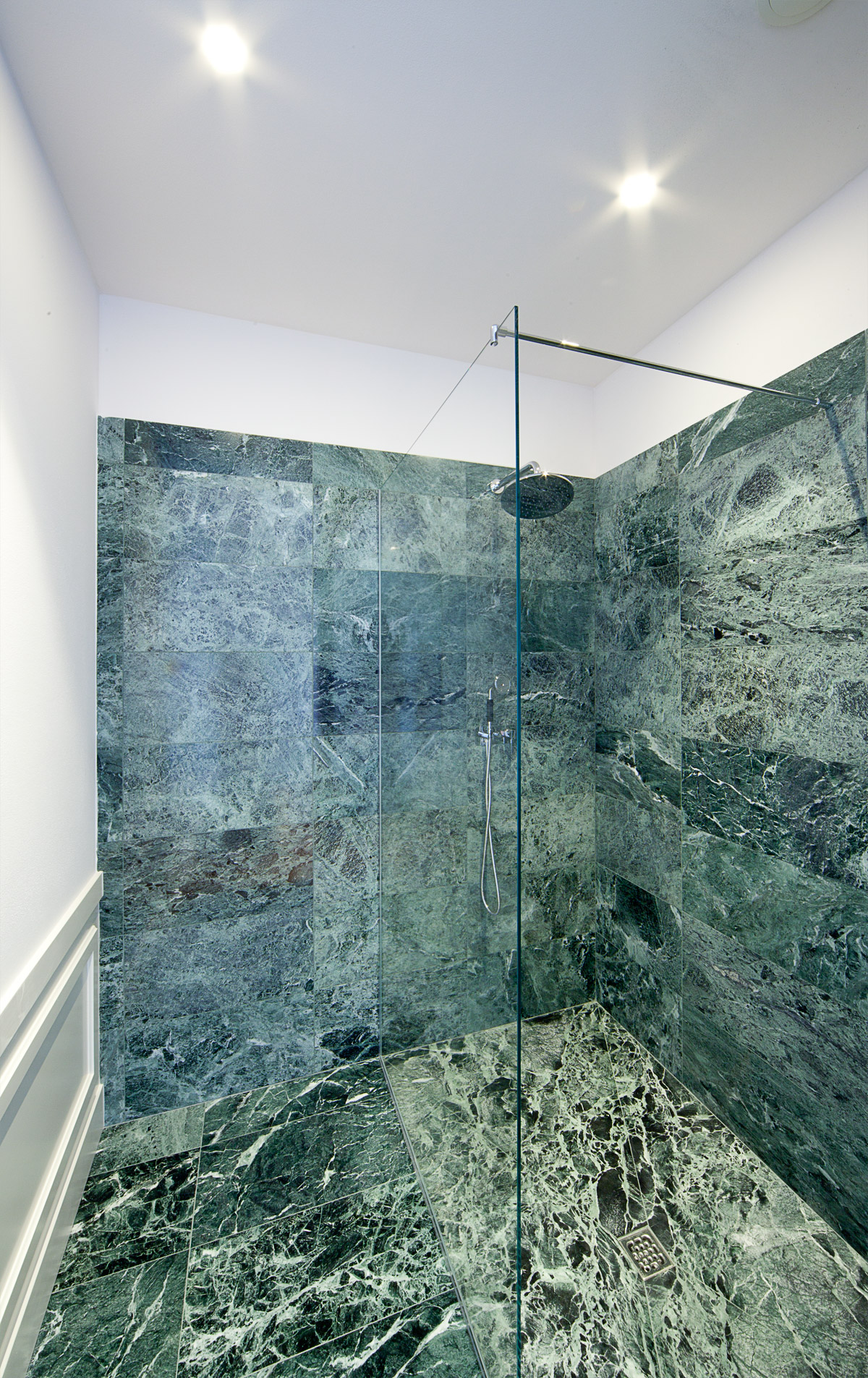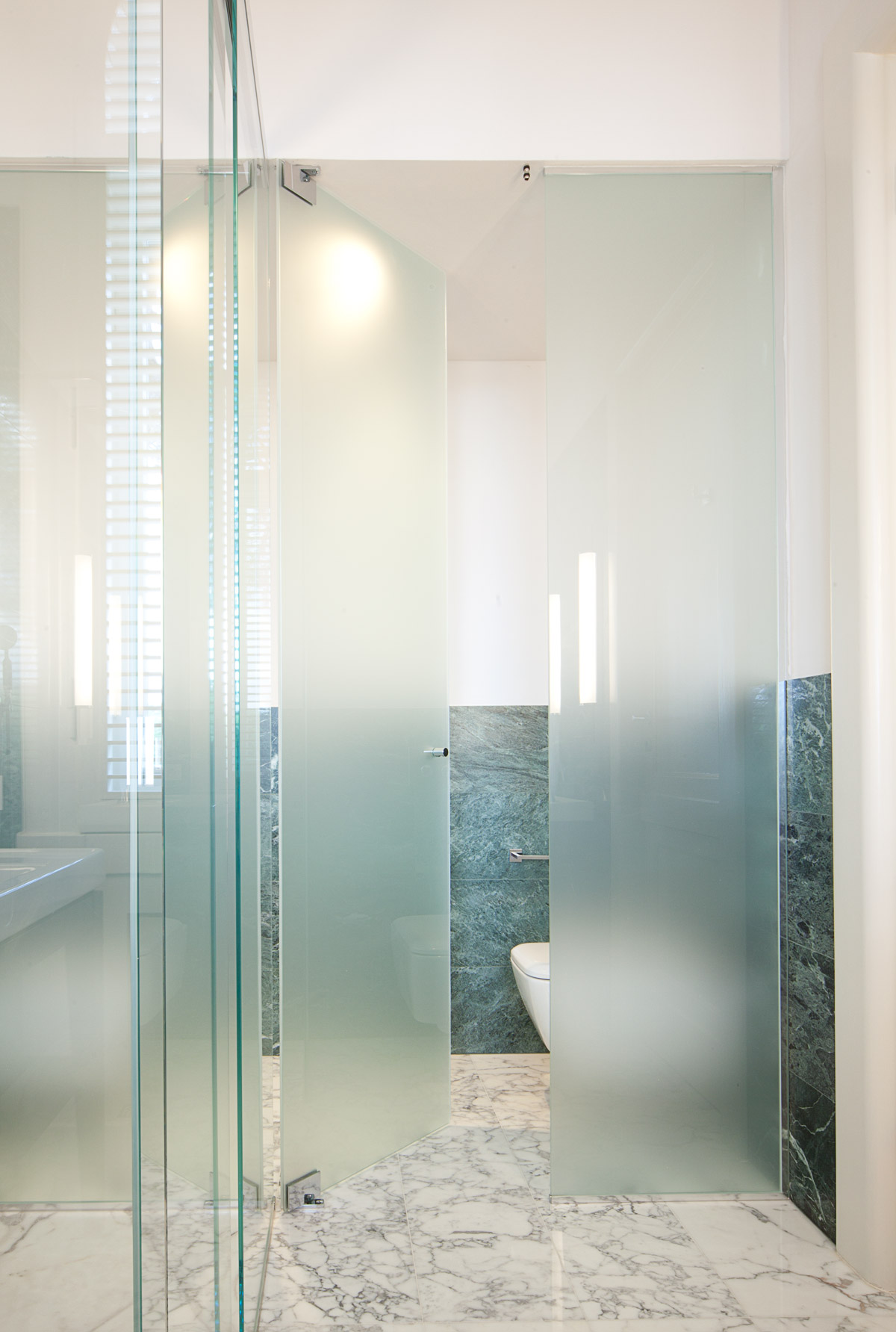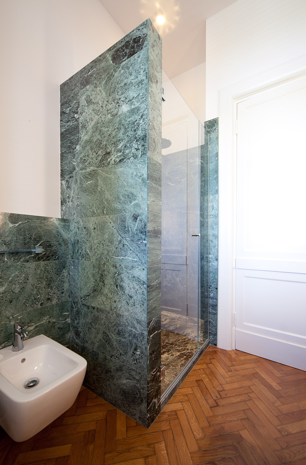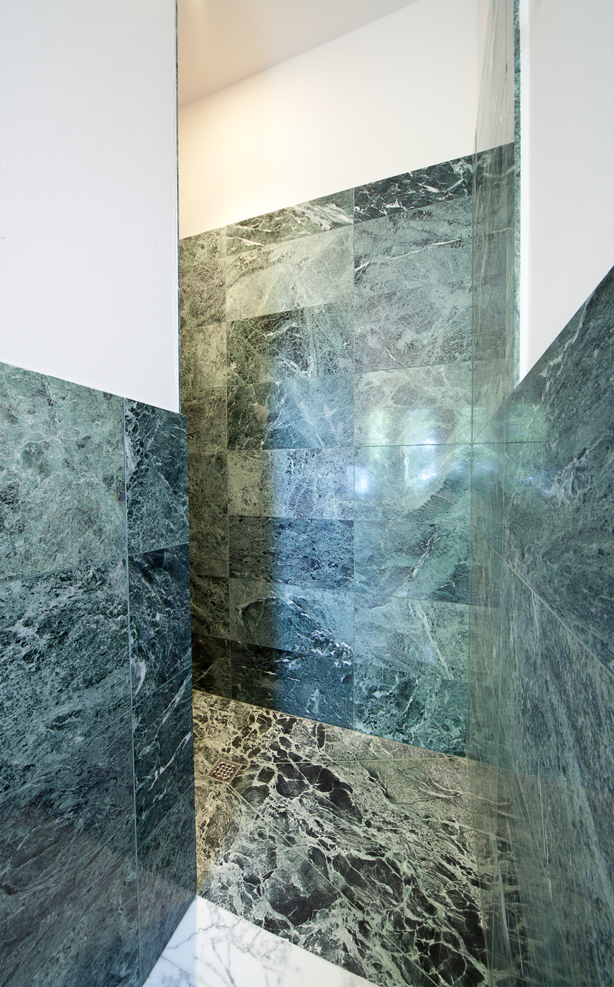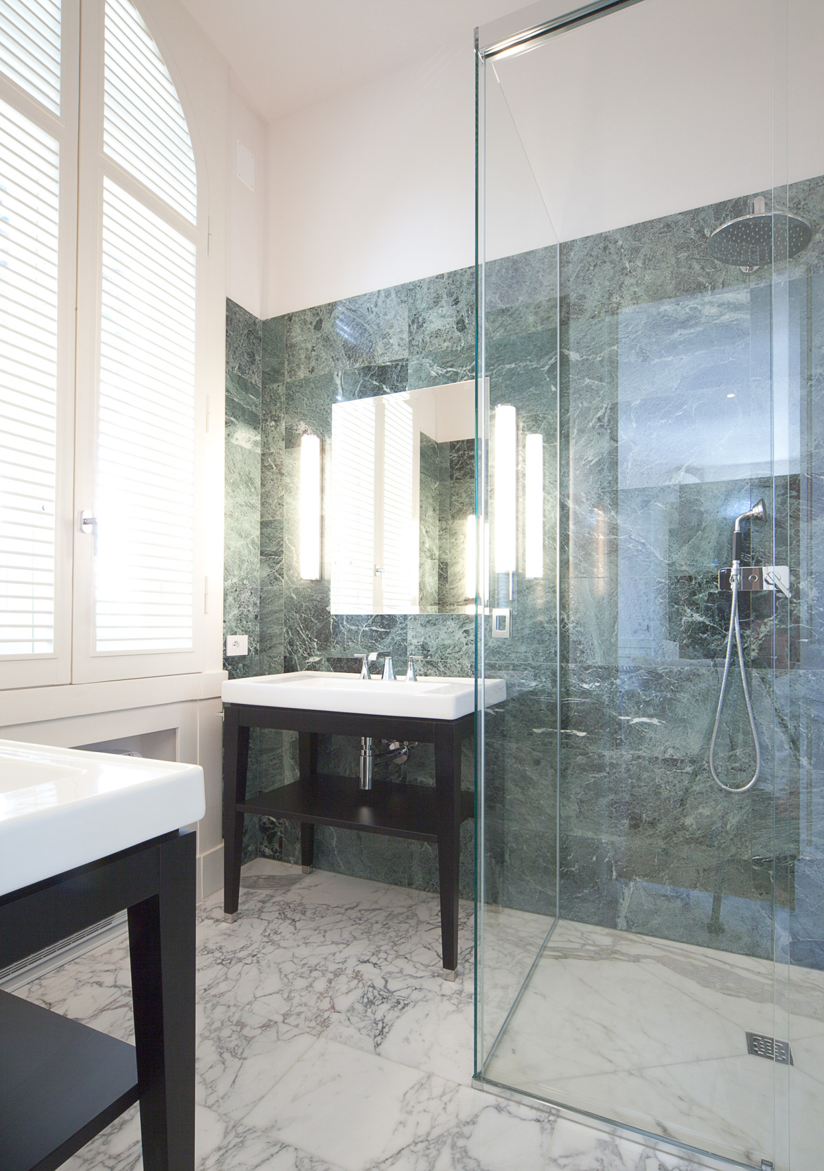 Grande attenzione è stata riservata alla scelta dei materiali di pavimento e rivestimento. Si è sposata in toto la bicromia tra marmo bianco e marmo verde, presente come nota distintiva nei pavimenti e nello scalone originali della villa. Così ciascun bagno è stato disegnato con un lastricato di marmo Arabescato Vagli posato a pavimento con schema a scacchiera, e un rivestimento murale in lastre di marmo Verde Alpi che corrono ad altezza variabile per tutte le pareti, ora alzandosi nell’ambiente doccia ora abbassandosi per lavabi e sanitari.