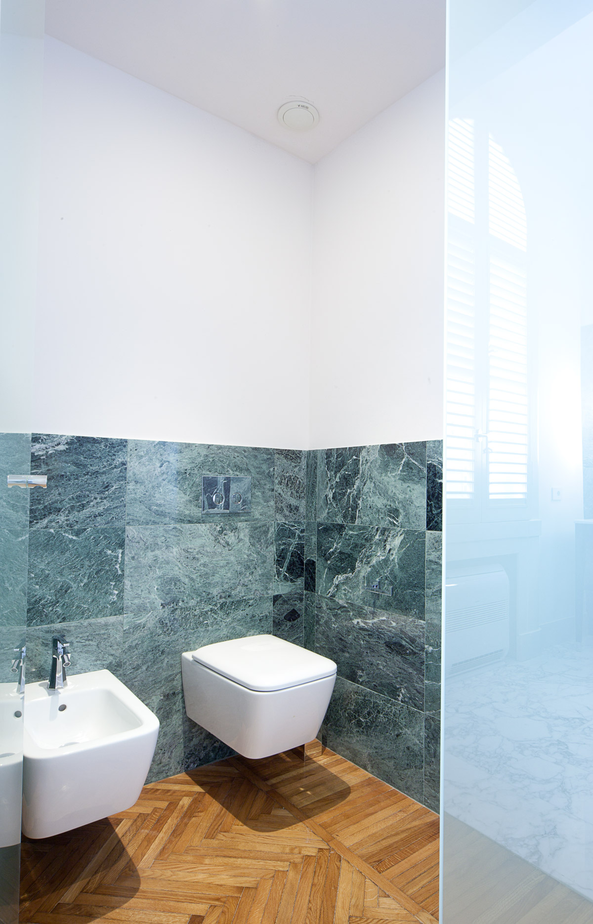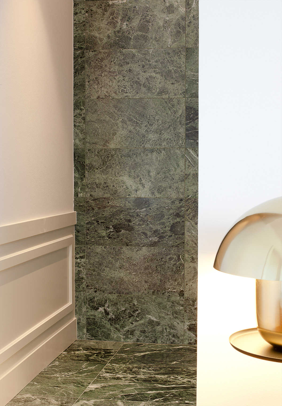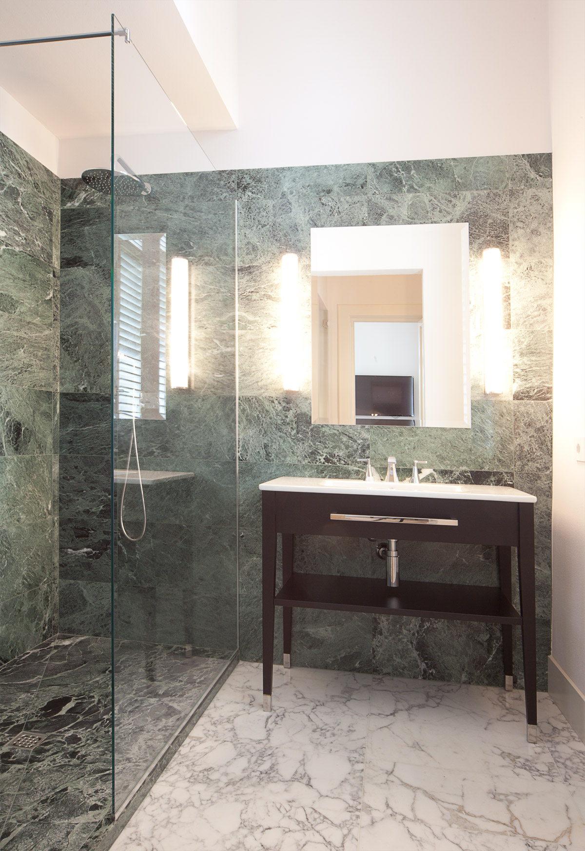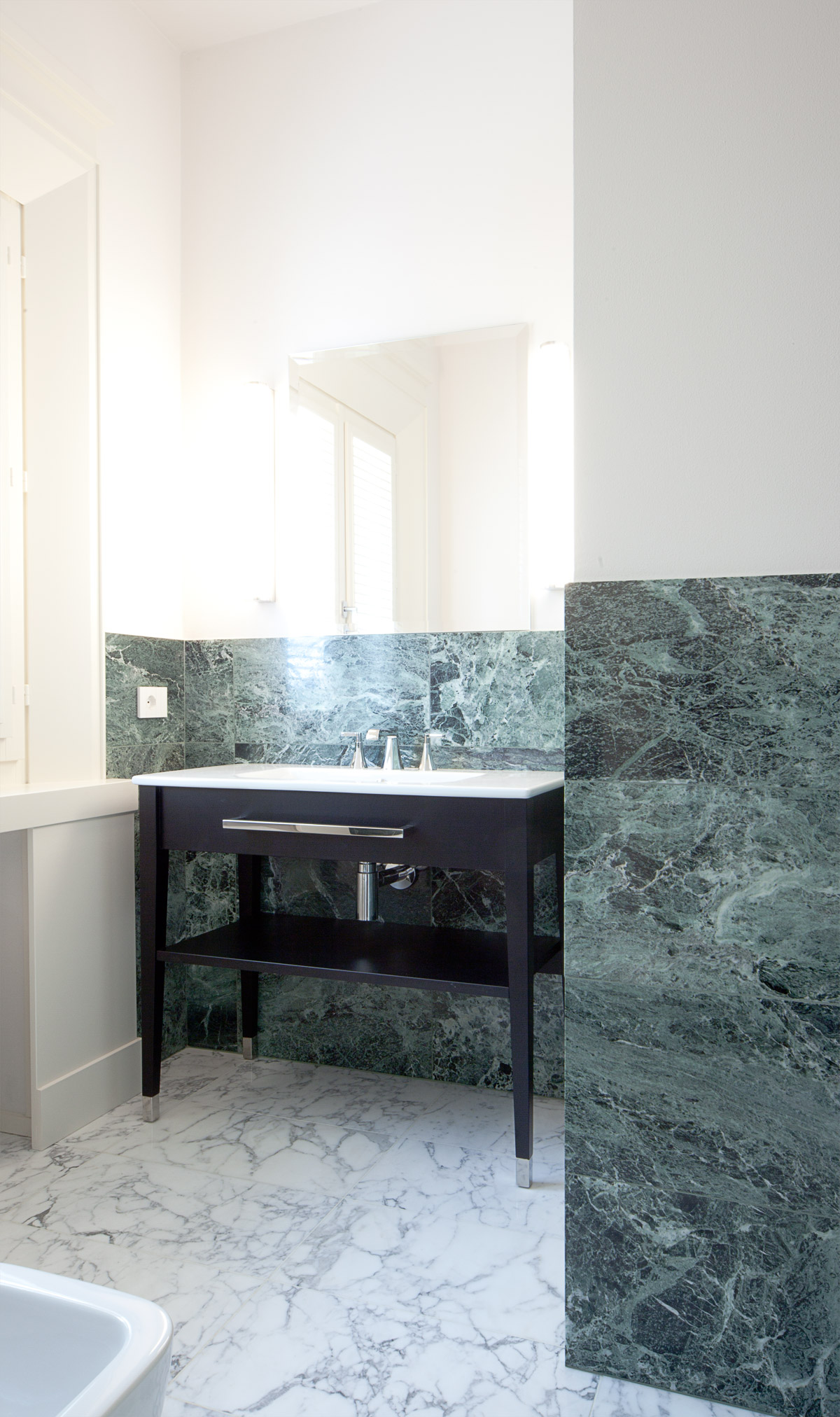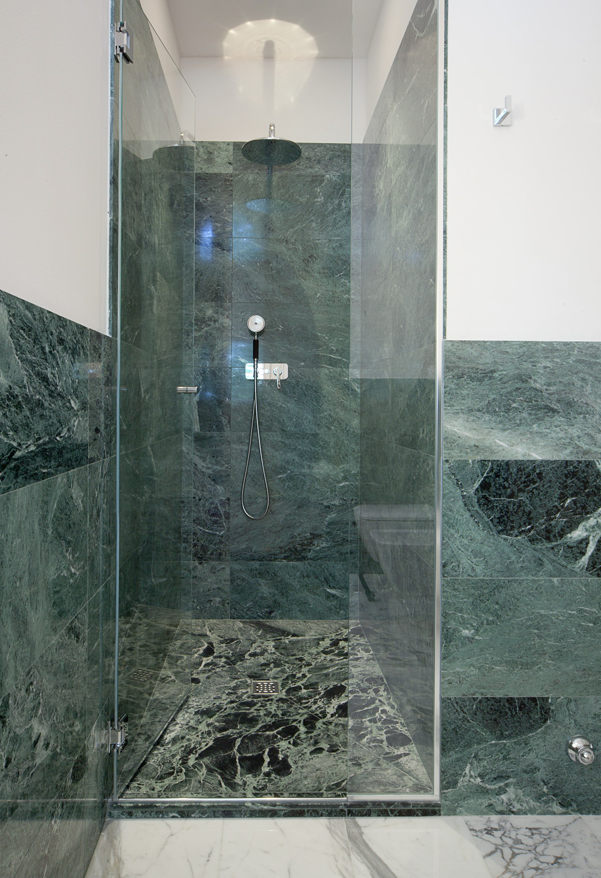 Grande attenzione è stata riservata alla scelta dei materiali di pavimento e rivestimento. Si è sposata in toto la bicromia tra marmo bianco e marmo verde, presente come nota distintiva nei pavimenti e nello scalone originali della villa. Così ciascun bagno è stato disegnato con un lastricato di marmo Arabescato Vagli posato a pavimento con schema a scacchiera, e un rivestimento murale in lastre di marmo Verde Alpi che corrono ad altezza variabile per tutte le pareti, ora alzandosi nell’ambiente doccia ora abbassandosi per lavabi e sanitari.