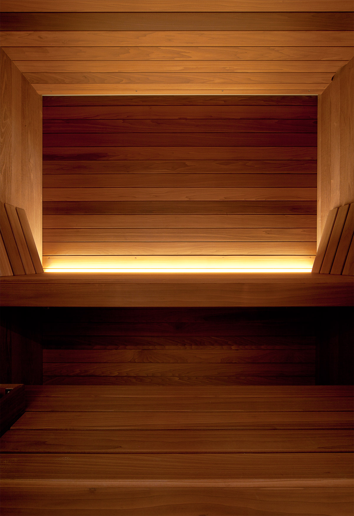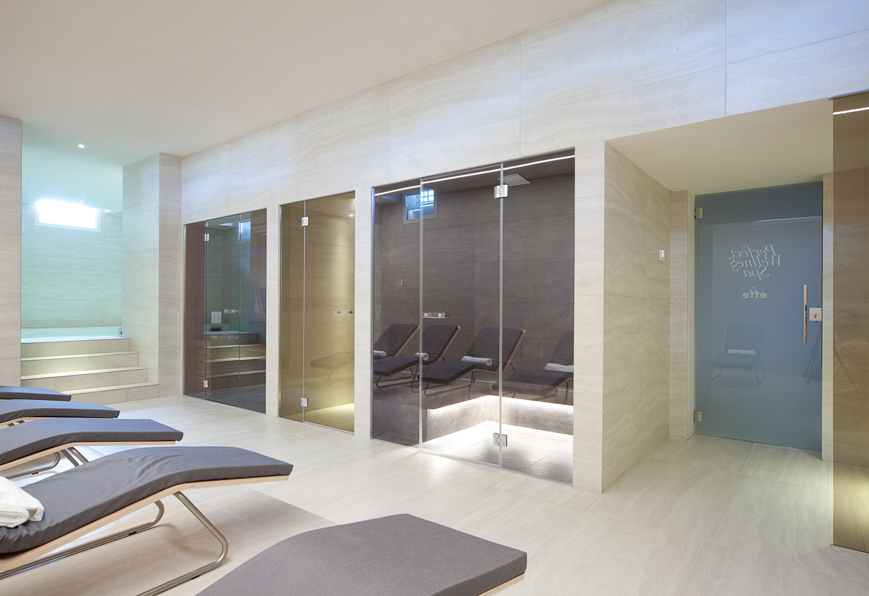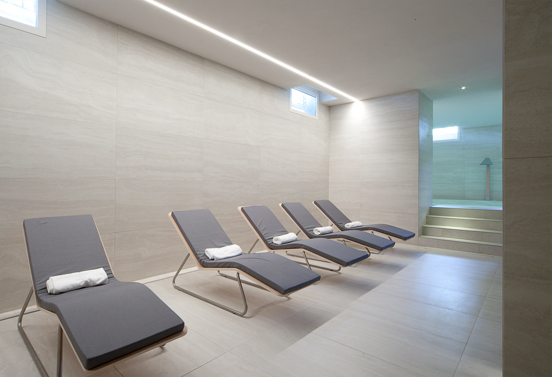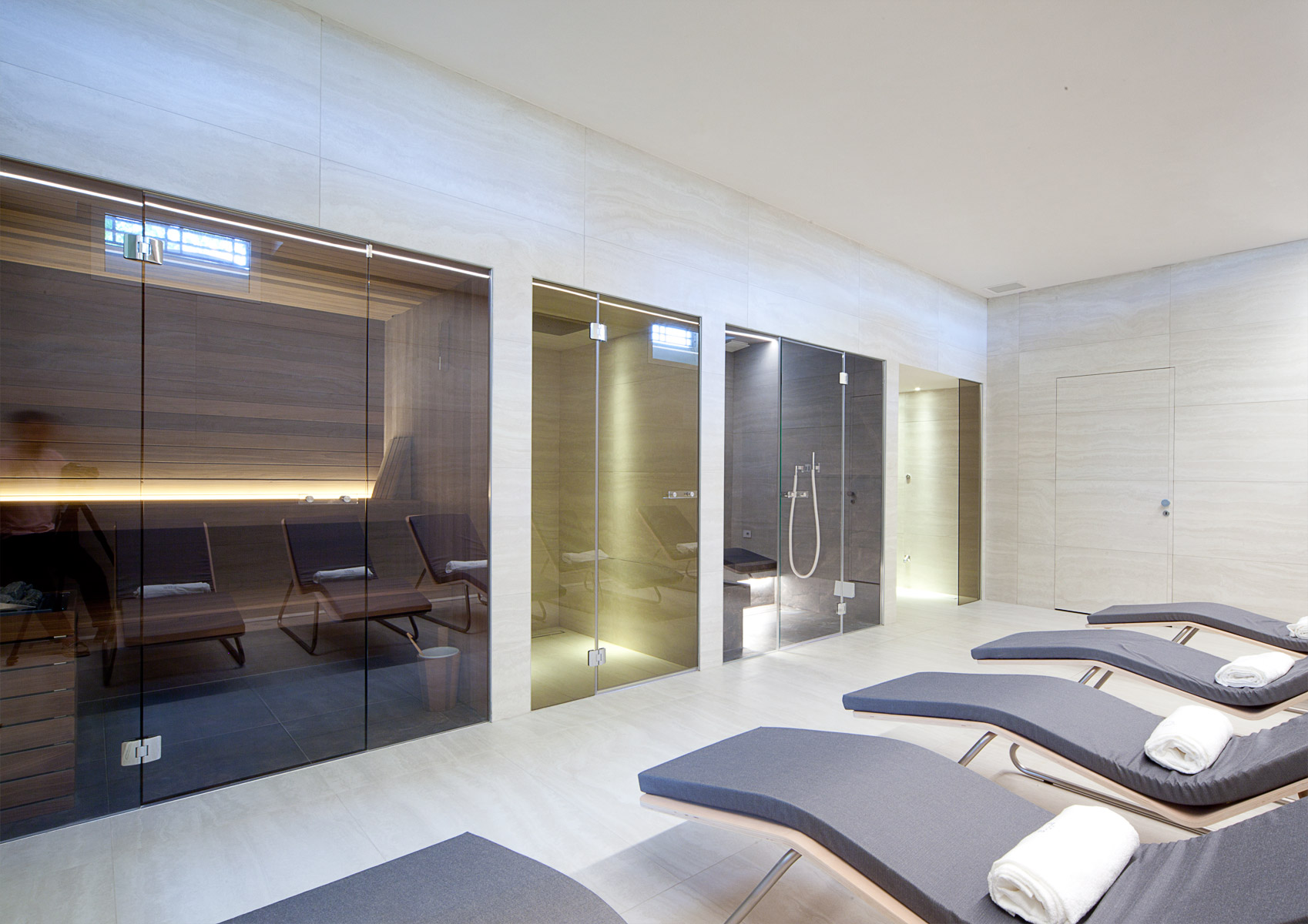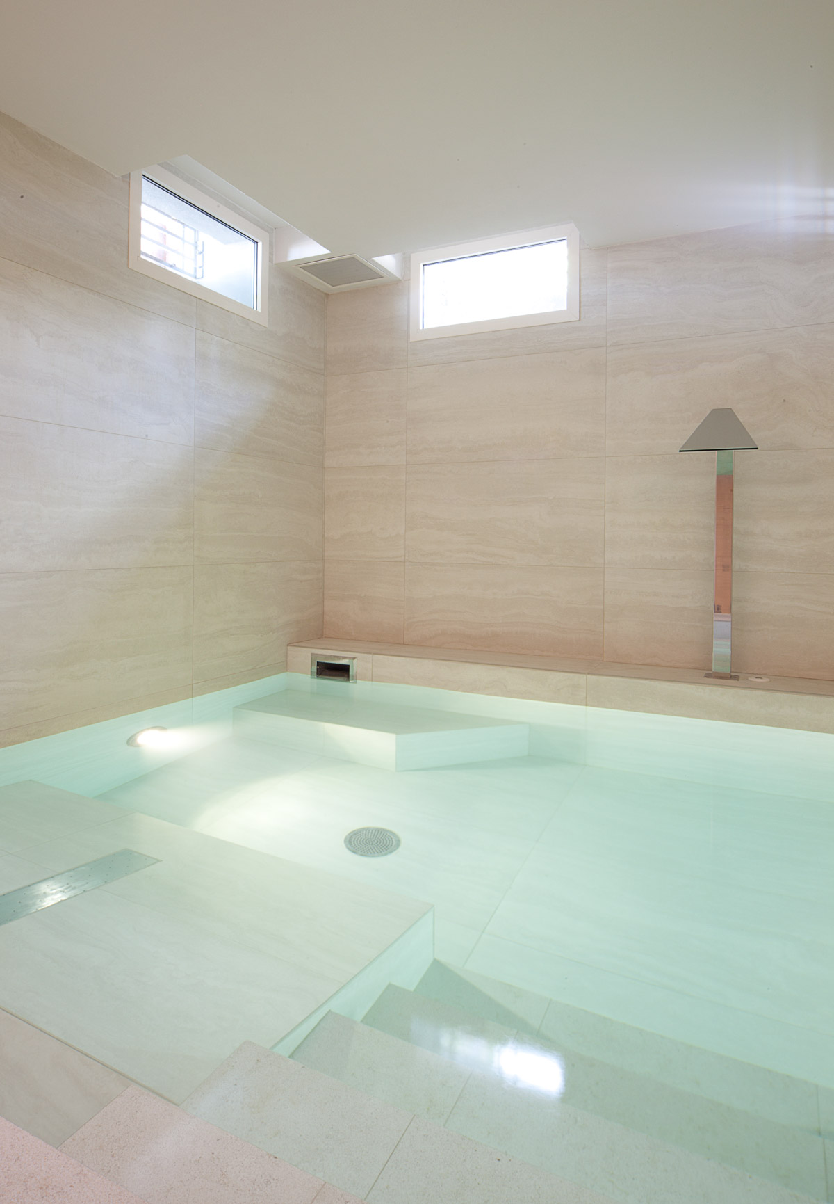 Il materiale scelto per il pavimento e i rivestimenti della spa è stato il travertino Il gioco dei rimandi questa volta riguarda gli esterni con la finitura in travertino di tutti gli imbotti delle finestre di piano terra e piano primo. Nella spa il travertino viene utilizzato in lastre a grande formato con dimensione costante, montate allineate. Uno schema semplice, potenziato dalla scelta di rivestire le pareti da cielo a terra, al fine di ricreare un effetto totalmente avvolgente nella sua aulica matericità. L’illuminazione del tutto, sempre molto morbida è costituita una serie di linee di luce che tagliano lo spazio amplificandone la dimensione. Suggestiva è la luce del sole del mattino che filtra con vaporosi tagli diagonali, da una serie di finestre alte poste sopra la quota del marciapiede esterno.