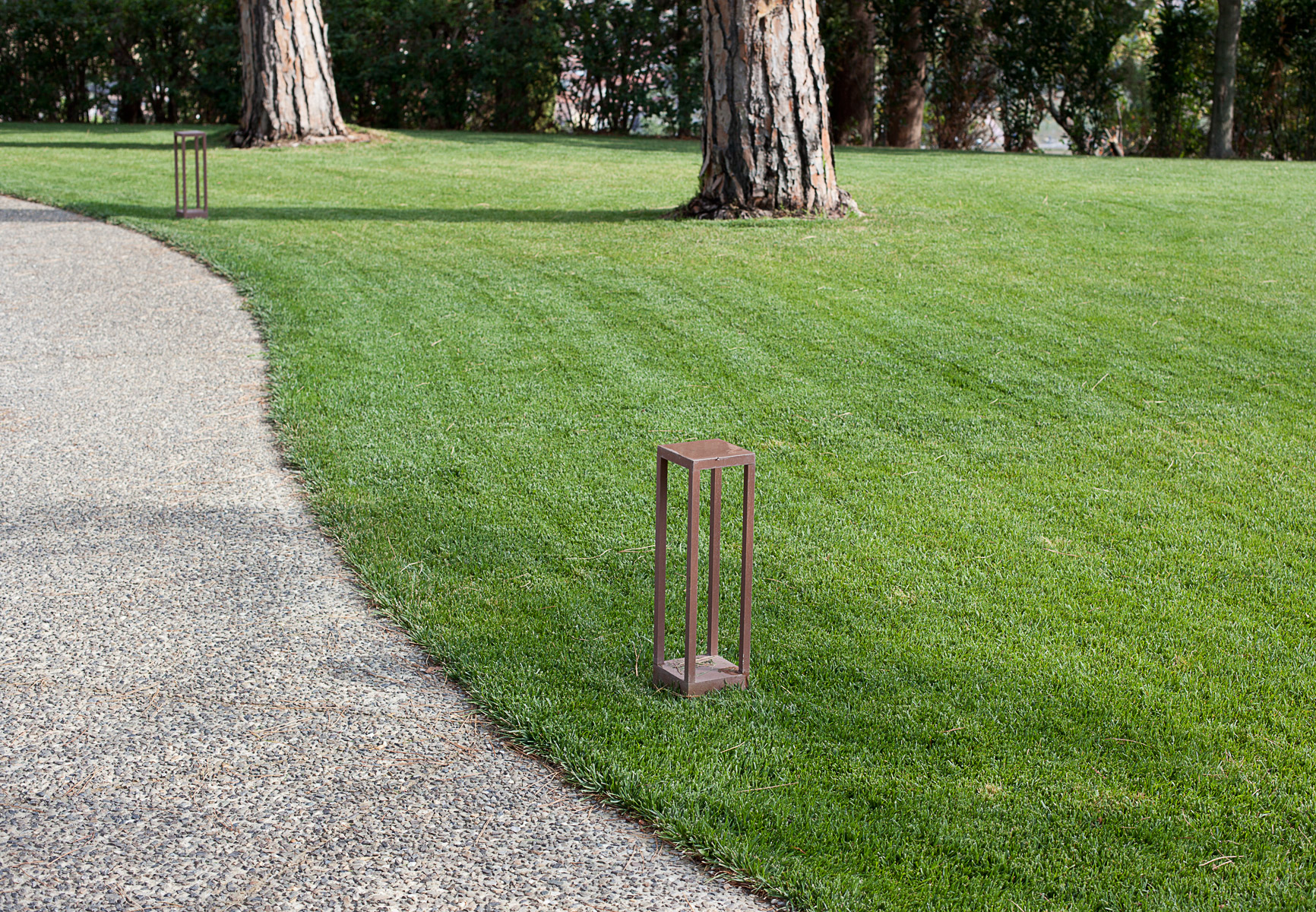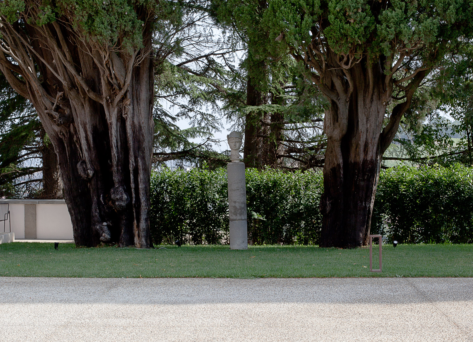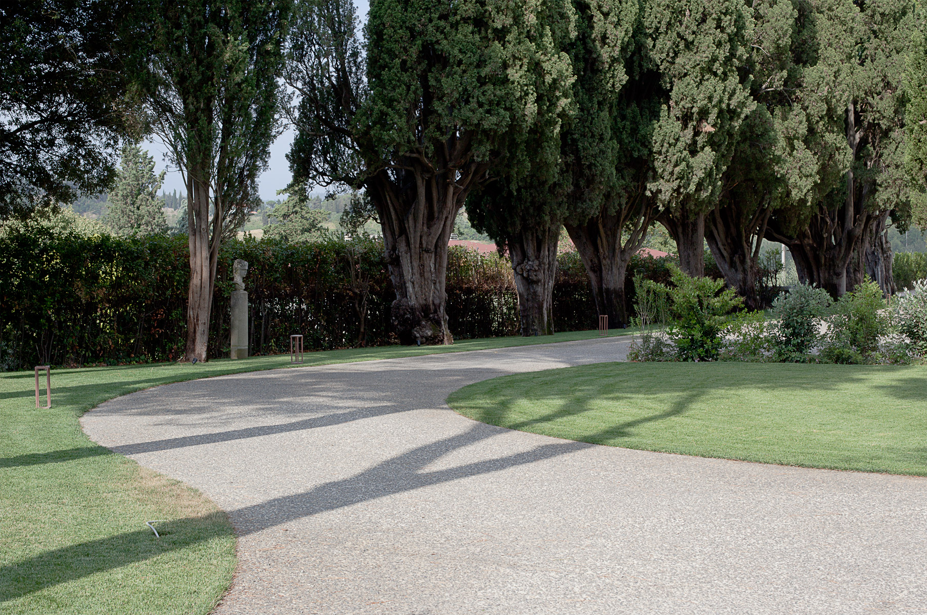 Per concludere, si riportano alcune considerazioni sull’illuminazione esterna. La villa ed il suo parco sono inseriti in contesto rurale completamente privo di illuminazione artificiale. Dunque è stata perseguita l’esigenza di valorizzare il complesso architettonico, contenendo e controllando l’intensità della luce così da interagire con equilibrio con la penombra circostante. La regia luminosa si è risolta in una serie di corpi illuminanti distribuiti uniformemente sui percorsi principali ad evidenziare le preminenze esistenti: una serie di faretti segna-passo a raso pavimento punteggiano la passerella centrale che conduce alla villa; faretti orientabili sono puntati sui tronchi di cipresso ad enfatizzarne la forma nodosa; la villa è illuminata con una serie di faretti a incasso posti lungo il marciapiede perimetrale e posizionati assecondando la partitura dei prospetti così da esaltare in notturna l’austera monumentalità del fabbricato. La loro luce è morbida e diffusa, così da scongiurare eccessive drammatizzazioni nella lettura delle facciate.
